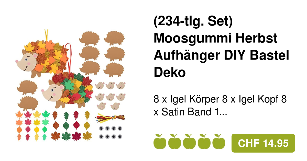 Wie süß sind denn diese Herbst-Aufkleber! 300 Stück in verschiedenen Ahornblatt-Formen - genug für viele Bastelprojekte. Aus glitzerndem Moosgummi - stabil und farbecht.\n\nSelbstklebend - einfach Schutzpapier abziehen und aufkleben. Perfekt für Kinderhände - kein Klebstoff kleckern. Weicher Filz - fühlt sich gut an und lässt sich gut schneiden.\n\nIn herbstlichen Farben - passt perfekt für Thanksgiving, Erntedank oder einfach herbstliche Deko. Für Grußkarten, Scrapbooking, Fensterdekoration oder Tischdeko.\n\nLichtecht - verblassen nicht in der Sonne. Machen jedes Bastelprojekt sofort festlich. Besonders im Kindergarten oder Grundschule ein Hit!\n\nAlso: Kreativität pur für den Herbst! Ob alleine oder mit Kindern - mit diesen Aufklebern wird Basteln zum Spaß.