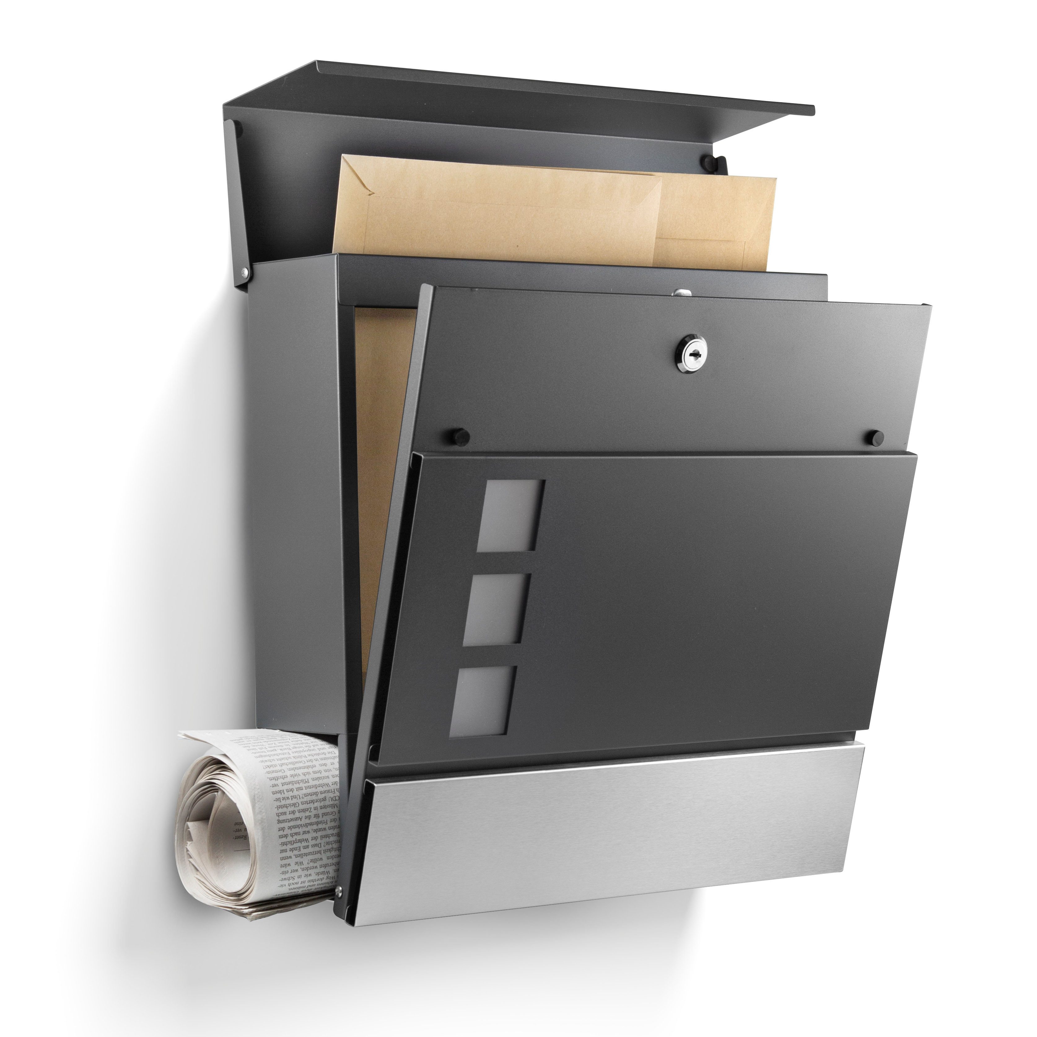 Mit 21,5 x 32 x 8,5 cm ist er genau die richtige Größe - nicht zu klobig, aber groß genug für Zeitungen und größere Briefe. Die Einwurföffnung von 19 x 4,3 cm ist auch perfekt dimensioniert.