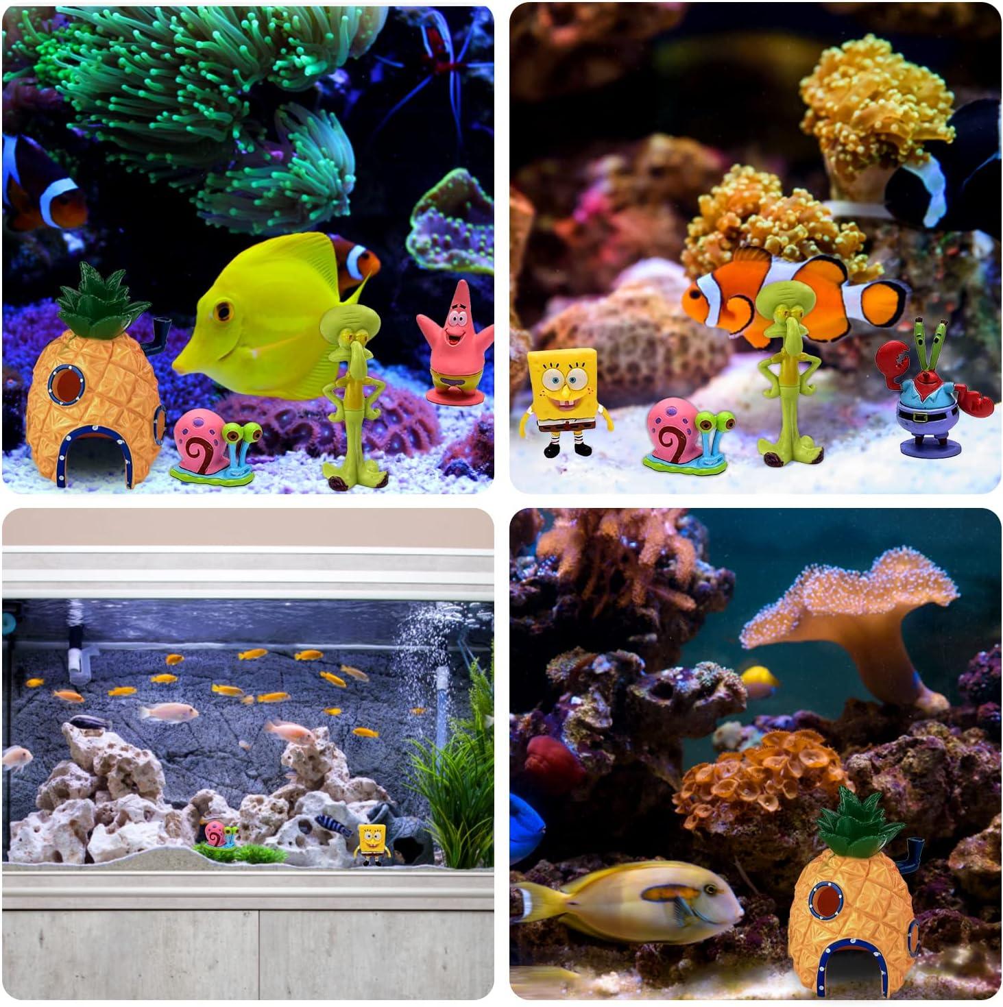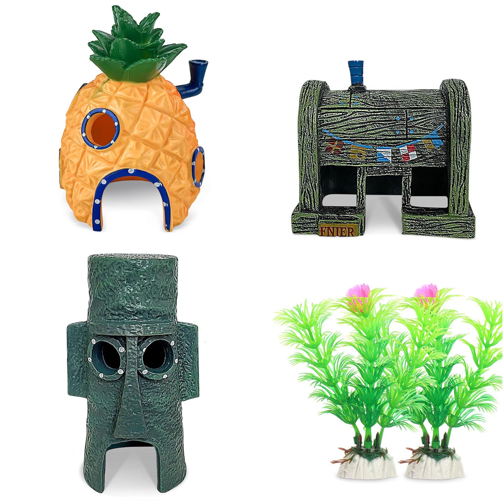 Verwandle dein Aquarium in eine bunte Unterwasserwelt aus Bikini Bottom! Dieses 11-teilige Set bringt jede Menge Spaß und Farbe in dein Aquarium. Enthalten sind: 1 Ananashaus (das berühmte Haus von Spongebob), 1 Krusty Krab Restaurant, 1 Osterinselhaus von Squidward, 6 niedliche Mini-Cartoon-Puppen und 2 Wasserpflanzendekorationen. Alle Teile sind aus hochwertigem, ungiftigem Harz gefertigt - absolut sicher für deine Fische und Garnelen. Die hohlen Häuser haben mehrere Eingänge, wo sich kleine Fische verstecken und spielen können. Die Dekorationen haben stabile Böden und stehen sicher im Aquarium. Perfekt für Süß- und Meerwasseraquarien! Einfach reinigen - nur mit warmem Wasser abspülen, keine Seife verwenden. Dieses Set macht nicht nur deinen Fischen Freude, sondern ist auch ein toller Hingucker für dein Zuhause!