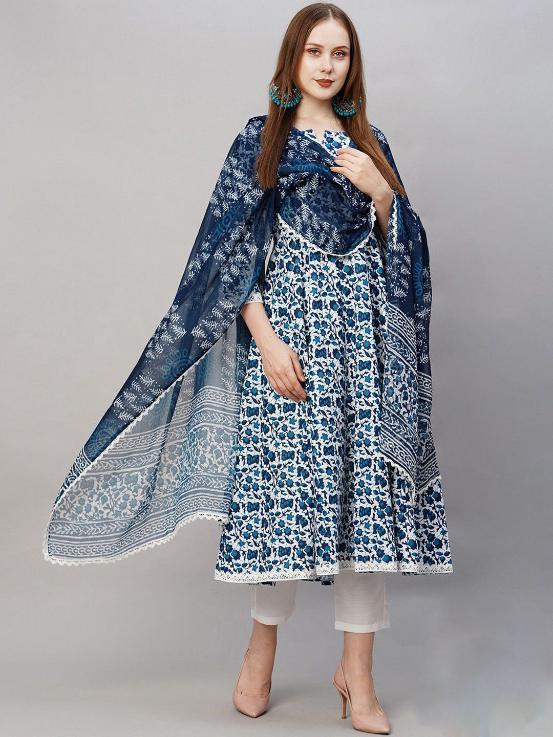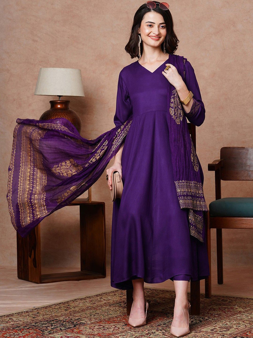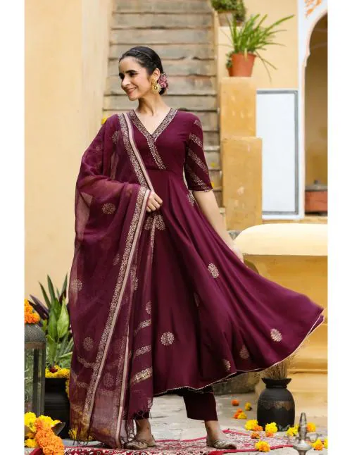 Einfach wunderschön! Dieses Anarkali Kurta Set von GoSriKi in Violett mit aufwendiger Stickerei ist ein echter Hingucker. Aus weicher Baumwollmischung angenehm zu tragen, mit 3/4-Ärmeln und V-Ausschnitt. Die wadenlange Kurta kombiniert mit passender Hose und Dupatta - komplett outfit für traditionelle Anlässe. Perfekt für Feste, Hochzeiten, Partys oder als Alltags-Outfit. In Größen S-XXL erhältlich. Die lockere Passform gibt Bewegungsfreiheit und sitzt trotzdem elegant. Ein Must-have für jede ethnische Garderobe - stylisch, bequem und absolut traumhaft!