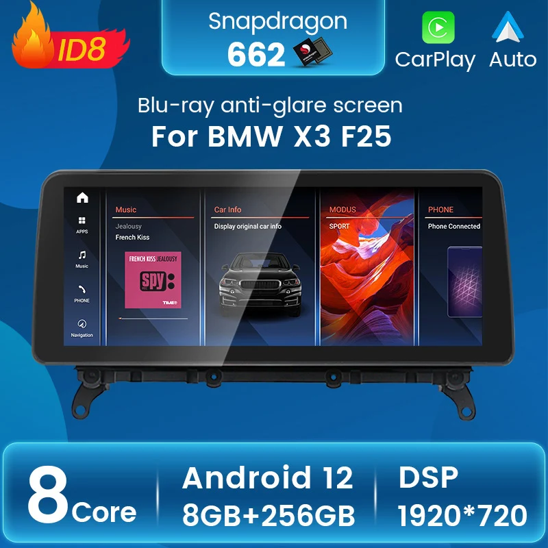 Upgrade dein BMW Entertainment! Dieses GONFEN Android 13 Autoradio mit 12,3\ IPS Touchscreen passt perfekt für BMW X3 F25 / X4 F26 (2014-2017) mit NBT System. 8GB RAM + 128GB ROM, 8-Kern Prozessor für flüssiges Multitasking. Integriertes Wireless CarPlay & Android Auto, DAB+, GPS Navigation, Bluetooth 5.0 und 4G Internet. Behält originale Fahrzeugfunktionen wie Lenkradsteuerung und iDrive bei. Mit DSP Sound System für perfekten Klang. Einfache Installation als Direktersatz - kein Kabelschneiden nötig. Mach deine Fahrten moderner und unterhaltsamer!