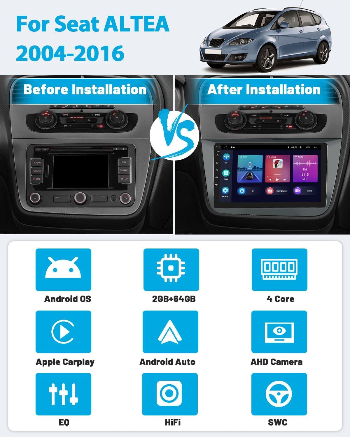 Modernisiere deinen Seat Altea! Dieses Android Autoradio bringt moderne Technik in dein Auto. Kompatibel mit Altea 2004-2015 (Linkslenker)! Riesiger 9 Zoll Touchscreen (1024x600) - alles klar im Blick! 2GB RAM + 64GB Speicher - läuft flott wie ein Smartphone! Wireless CarPlay & Android Auto - kabellos verbinden! Integriertes GPS - Online/Offline Navigation! Bluetooth, Wifi, FM/RDS Radio - alle Features dabei! Mit AHD Rückfahrkamera - sicher einparken! Einfacher Einbau - Stecker rein und fertig! Mach deine Fahrten moderner und sicherer - upgrade dein Auto!
