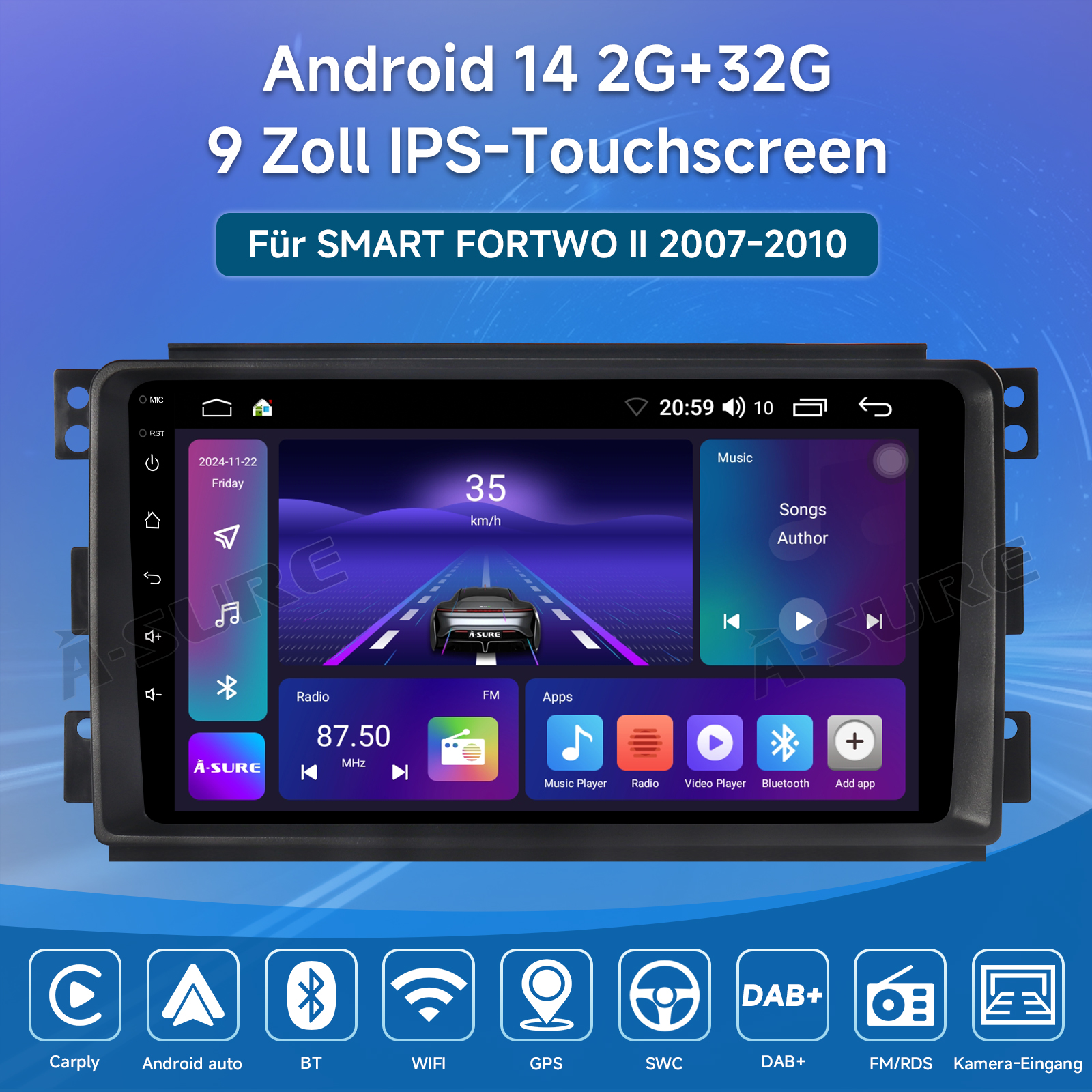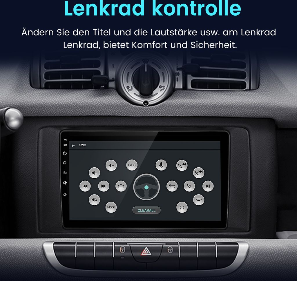 Hey, aufrüsten war noch nie so einfach! Dieses Android Autoradio macht deinen Smart Fortwo 451 (2005-2010) zum rollenden Entertainment-Center. Mit dem 9 Zoll HD-Touchscreen siehst du alles kristallklar. 4GB RAM und 64GB Speicher sorgen für flottes Menü - da ruckelt nichts! Das coole Feature: Wireless Carplay und Android Auto - einfach Handy verbinden und los geht's. Du hast Zugriff auf deine Musik, Navigation, Kontakte und mehr. Der eingebaute GPS-Navi führt dich sicher ans Ziel, egal ob online oder offline. Mit WLAN surfst du im Internet, streamst YouTube oder hörst deine Lieblingsplaylists. Praktisch: Die Lenkradsteuerung bleibt erhalten und die AHD-Rückfahrkamera zeigt dir, was hinter dir passiert. FM/RDS Radio mit 18 Speicherplätzen, Bluetooth 5.0 für Freisprechanrufe und doppelte USB-Anschlüsse runden das Paket ab. Einfach einbauen und sich über modernste Technik freuen - dein Smart wird's dir danken!