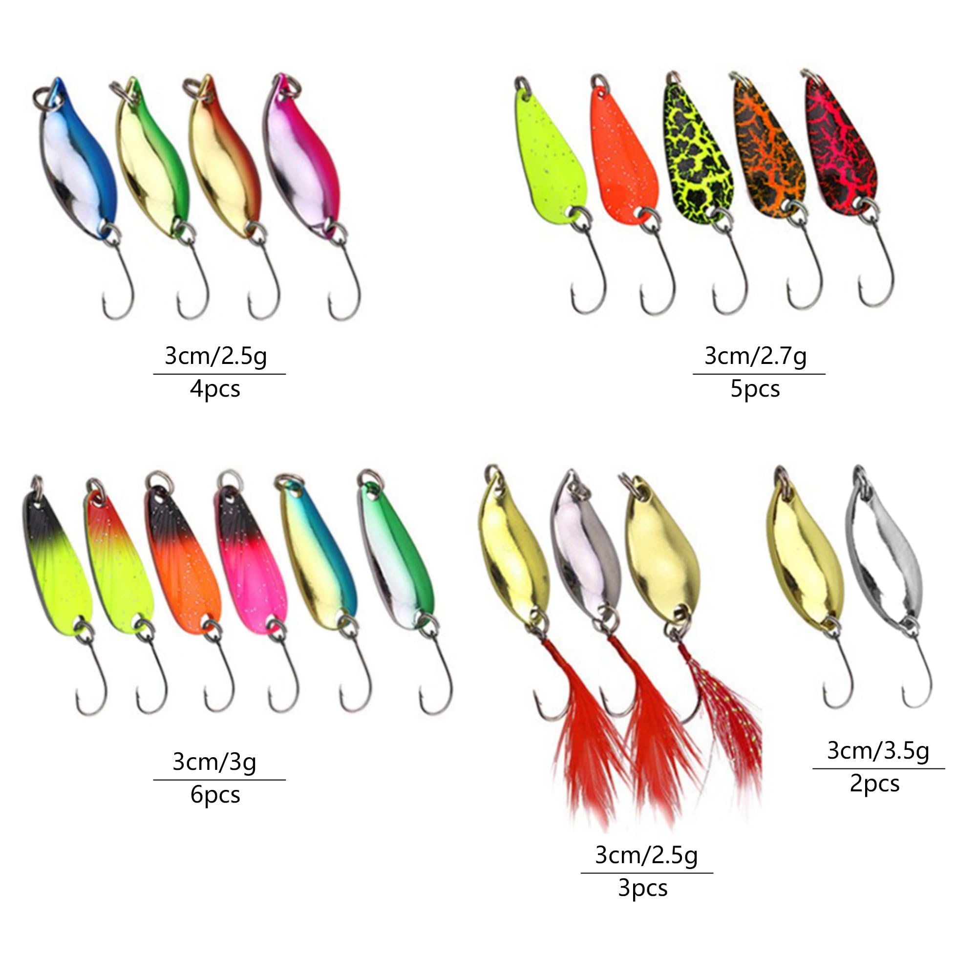 Willst du mehr Fänge an Land ziehen? Dieses 14-teilige Forellen-Spoon-Set ist dein Geheimwaffe! Enthalten sind Köder in 5 verschiedenen Gewichtsklassen: 3g, 3.5g, 4.6g, 5g und 5.2g - für jede Angelituation die perfekte Wahl. Jeder Spoon hat einen scharfen Einzelhaken an der Spitze plus drei Widerhaken an der Unterseite, damit der Fisch nicht mehr entkommt. Die mitgelieferten Wirbel mit Karabiner ermöglichen eine 360°-Rotation - dein Köder schwimmt so natürlich wie ein echter Fisch! Aus robustem, korrosionsbeständigem Metall, das im Wasser verführerisch glänzt. Ideal für Forellen, Barsch, Hecht, Zander und viele andere Süßwasserfische. Perfekt für Anfänger und Profis gleichermaßen. Die Köder sind auf der Rückseite markiert, sodass du schnell den richtigen findest. Ob im Fluss, See oder am Meer - mit diesem Set bist du für jede Angelgelegenheit gerüstet. Ein super Geschenk für Angler zum Vatertag, Geburtstag oder einfach so!