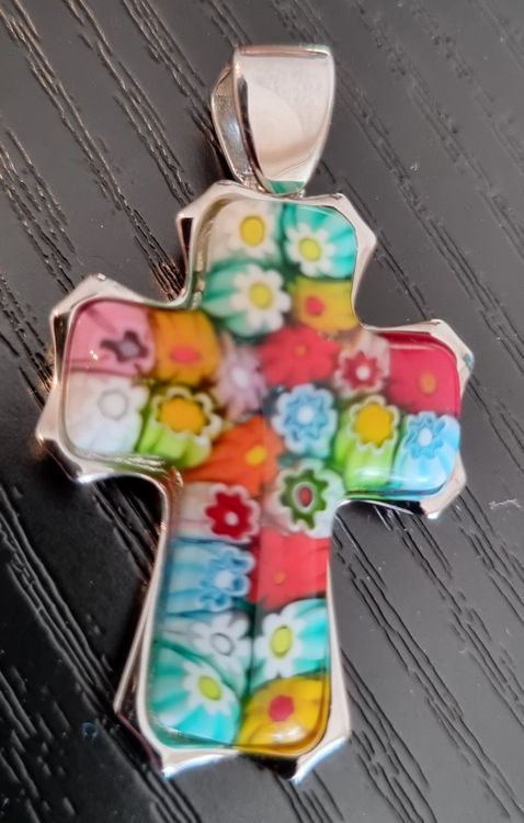 Was für ein wunderschöner Murano Glas Kreuz-Anhänger! In den typischen, lebendigen Murano-Farben handgefertigt, ist dieses Kreuz ein echter Hingucker. Mit ca. 3,5 x 2,5 cm ist es genau die richtige Größe - nicht zu groß, nicht zu klein. \\n\\nDas bunte Glas schimmert je nach Lichteinfall in verschiedenen Farbtönen und fängt das Licht auf einzigartige Weise ein. Jedes Stück ist ein Unikat, da handgefertigte Murano-Glas-Produkte immer leichte Variationen aufweisen. \\n\\nPerfekt als Geschenk für besondere Anlässe wie Taufe, Kommunion oder Konfirmation. Aber auch als täglicher Begleiter am Halsband oder einfach als dekoratives Element. \\n\\nDie traditionelle Murano-Glas-Herstellung garantiert höchste Qualität und intensive Farben. Ein Stück italienische Handwerkskunst, das gute Laune macht. \\n\\nEinfach bezaubernd und voller Lebensfreude - dieser Anhänger bringt Farbe in dein Leben!