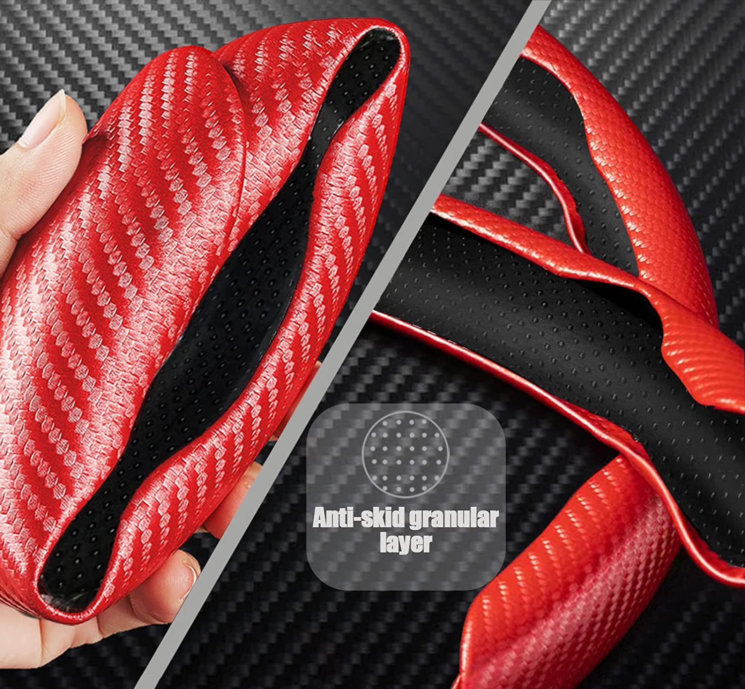 Mach dein Lenkrad bequemer und stylischer! Diese 2-teilige Abdeckung in Kohlefaser-Optik sieht nicht nur sportlich aus, sie verbessert auch den Griff. Die robuste, doppellagige Schale schützt dein Original-Lenkrad, während das flexible Silikon-Innenmaterial für einen angenehmen und rutschfesten Halt sorgt. Die Montage ist supereinfach und werkzeuglos - einfach auflegen und festdrücken. Passt für die meisten runden oder D-förmigen Lenkräder mit etwa 38 cm (15 Zoll) Durchmesser. Die integrierten Entlastungstasten sorgen dafür, dass sich die Abdeckung perfekt anpasst. Verleihe deinem Fahrzeuginnenraum sofort ein aufgewertetes, individuelles Look - für mehr Fahrspaß und Komfort bei jeder Fahrt.