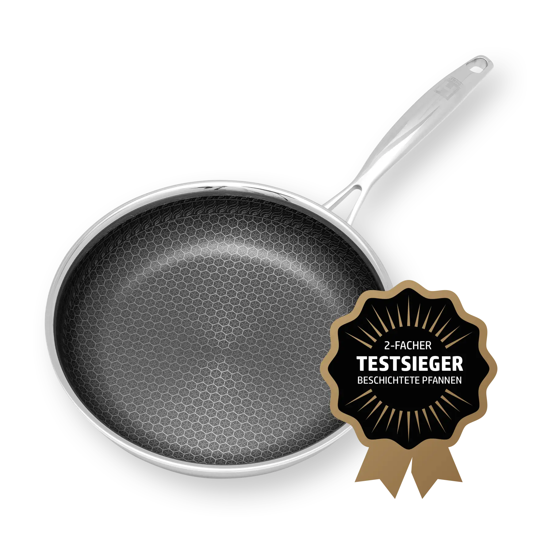 Die große, ebene Bratfläche mit schräger Kante macht das Wenden und Ausgießen super einfach. Dank optimaler Wärmeverteilung brennt nichts mehr an - perfekt für Fleisch, Fisch und Gemüse.