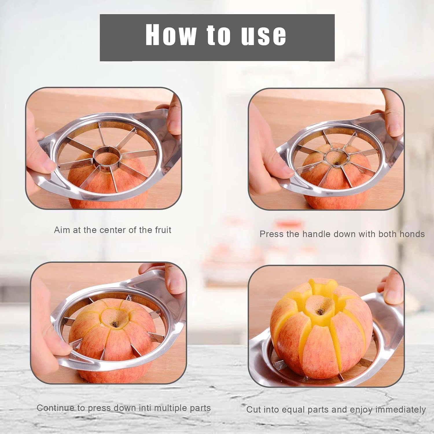 Mega praktisch dieses Teil! Schneidet Äpfel mit einem Druck in 8 perfekte Stücke und entfernt dabei das Kerngehäuse. Aus lebensmittelechtem 304er Edelstahl - rostfrei und super scharf! Mit ergonomischem, rutschfestem Griff - liegt perfekt in der Hand. Nicht nur für Äpfel - auch für Birnen, Kartoffeln, Tomaten und anderes Obst/Gemüse geeignet. Spart so viel Zeit in der Küche! Perfekt für Obstsalat, Kuchen oder gesunde Snacks für die Kinder. Einfach zu reinigen - spülmaschinengeeignet! Robust verarbeitet - hält ewig. Macht jedes Mal perfekte, gleichmäßige Schnitte. Super Geschenk für Hobbyköche oder Familien! Einfach Apfelschneider in die Mitte drücken - zack, fertig! Ein Küchenhelfer den man nicht mehr missen will!