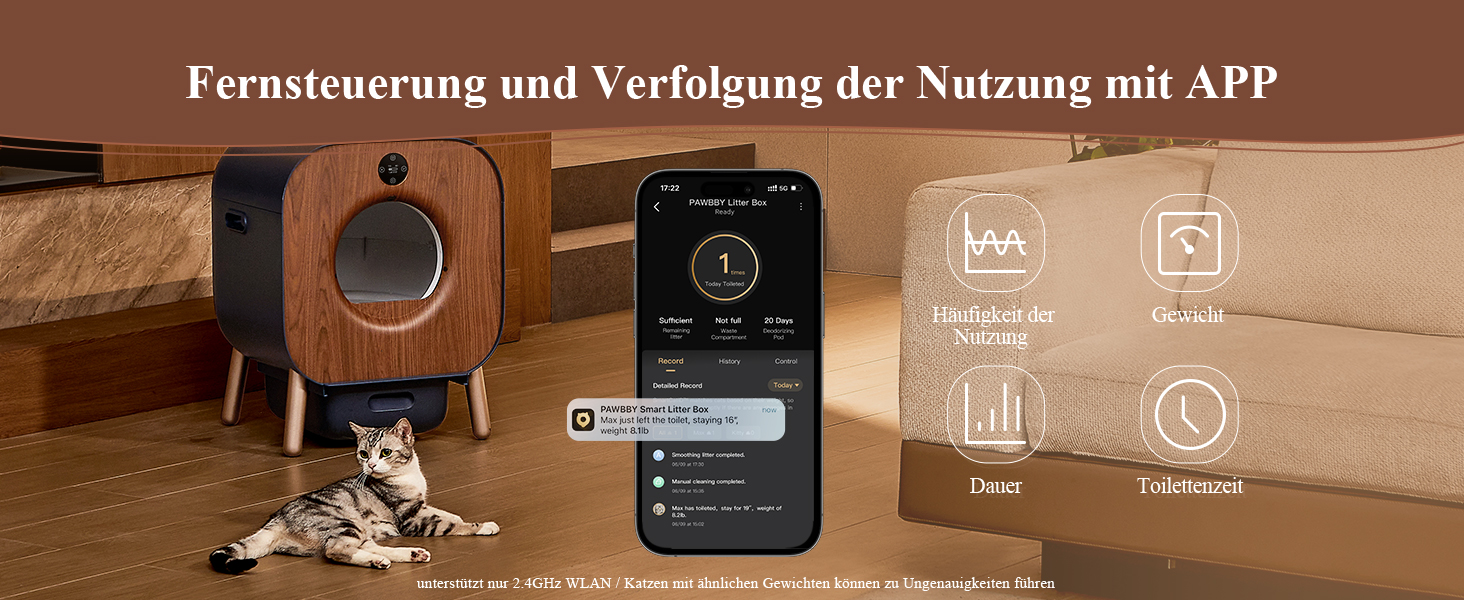Müde vom Katzenklo reinigen? Dieses selbstreinigende Katzenklo erledigt die Arbeit für dich! XXL-Größe für Katzen von 1,5-12,5kg, perfekt für Mehrkatzen-Haushalte. Offenes Design - deine Katze fühlt sich wohl und es stinkt nicht. Steuerung per App, manuell oder automatisch. 10 Sensoren sorgen für Sicherheit - stoppt sofort wenn die Katze reingeht. Integrierte Duftbox neutralisiert Gerüche, arbeitet leise unter 50dB. Funktioniert mit allen Streu-Arten. Einfach zu reinigen, großer 10,5L Abfallbehälter. Endlich mehr Zeit für dich und deine Katze!