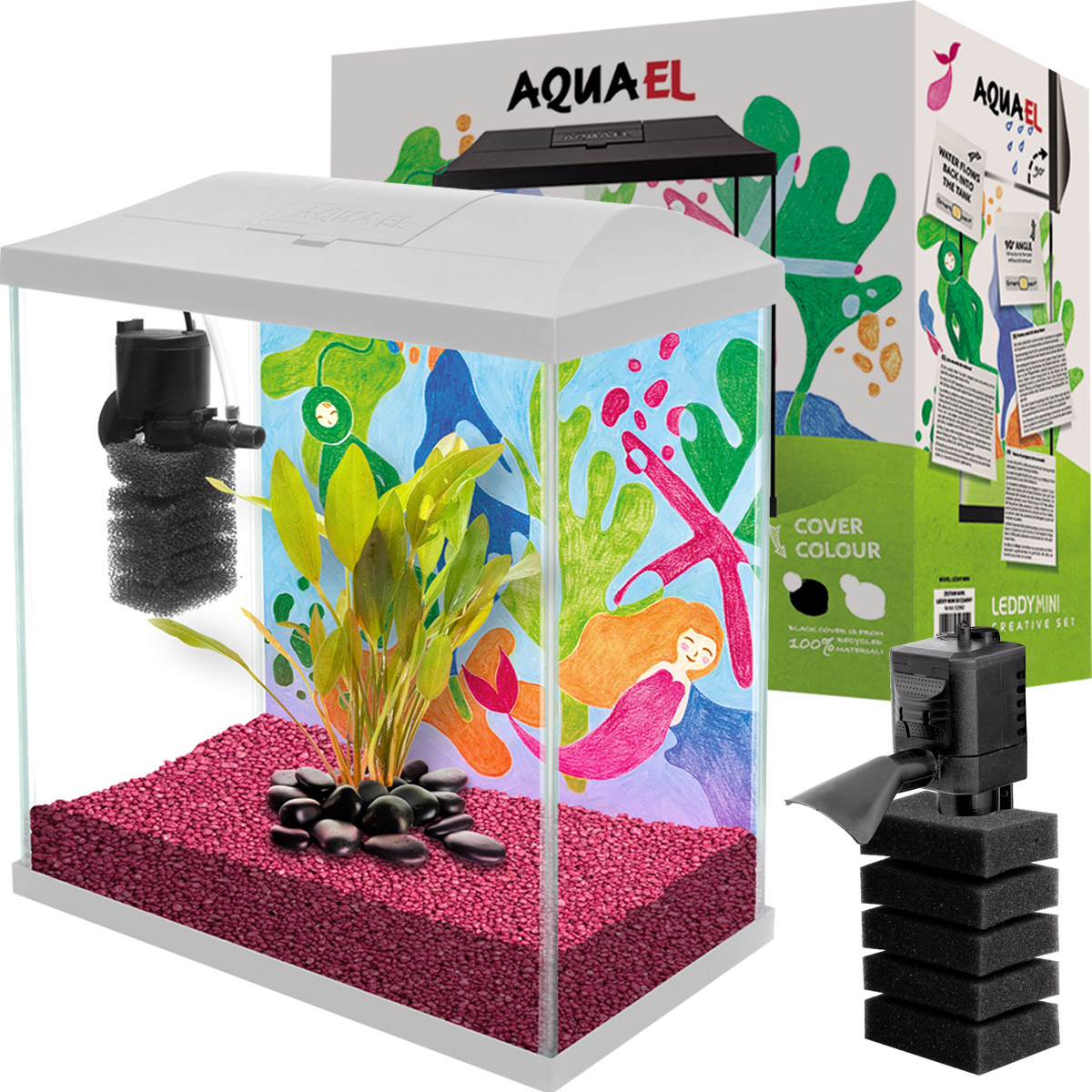 Das perfekte Starter-Aquarium für Einsteiger und Kinder! Das Aquael Leddy Mini 30 in Weiß ist ein tolles Komplett-Set, das wirklich alles enthält, was du für den Einstieg in die Aquaristik brauchst. Mit seinem robusten FLOAT-Glas und dem schützenden Bodenrahmen ist es besonders sicher und langlebig. Der leistungsstarke Turbo Mini Filter mit 320 l/h Kapazität hält das Wasser zuverlässig sauber und bietet zusätzlich Belüftung mit einstellbarer Wasserstrahlrichtung. Das praktische Smart Open System der Abdeckung verhindert lästiges Spritzwasser beim Öffnen. Besonders süß: Der bunte, doppelseitige Hintergrund mit Malvorlage auf der Rückseite lädt zum kreativen Gestalten ein. Hergestellt in Europa und umweltfreundlich - die schwarze Version besteht sogar aus recycelten Materialien! Die Verpackung mit praktischem Griff macht es zum idealen Geschenk. Mit Halterung für Aquael Beleuchtungssystem (Leuchtmittel separat erhältlich). Tauche ein in die faszinierende Welt der Aquaristik - dieses Set macht den Einstieg super einfach und unterhaltsam!