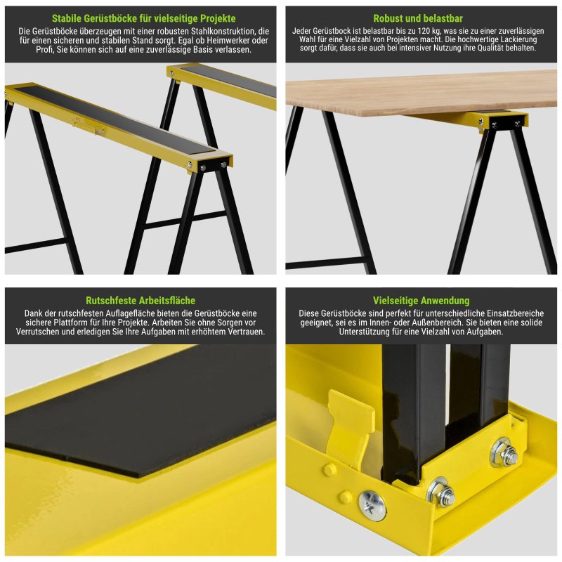 Mega praktisch diese Sägeböcke! Das 2er Set ist perfekt für jede Werkstatt. Aus starker Eisen-Kohlenstofflegierung mit Galvanisierung - richtig robust und langlebig. Hält bis zu 1200 kg aus - da kannst du ohne Bedenken drauf arbeiten.