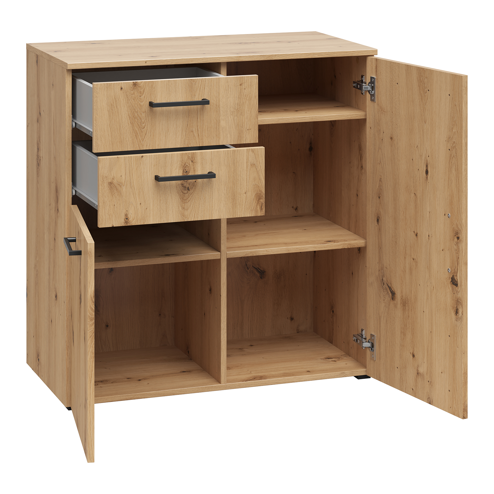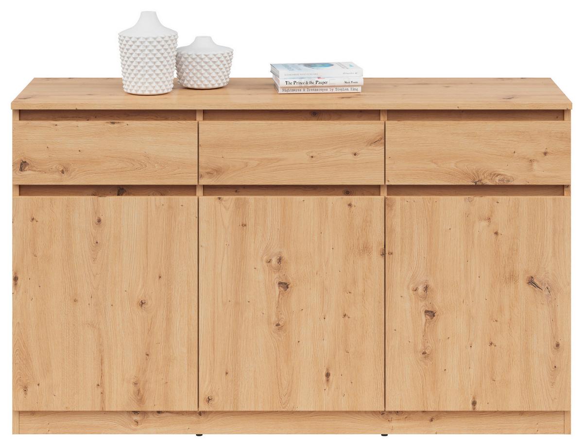 Boah, die Brest Kommode ist einfach der Hammer! Sie kommt in diesem tollen Artisan Eiche Look daher und hat so cleanen, modernen Style. Perfekt für alle, die nicht nur was Schickes suchen, sondern auch praktischen Stauraum brauchen. Ob im Flur, Schlafzimmer oder Wohnzimmer - die passt einfach überall hin! Und das Beste: Die grifflose Front sieht nicht nur mega aus, sondern ist auch super pflegeleicht dank Melaminbeschichtung. Hinter den drei Türen versteckt sich ein Einlegeboden, wo du alles ordentlich verstauen kannst. Plus zwei Schubkästen für noch mehr Platz! Die Ablagefläche oben ist ideal für deine Deko, Pflanzen oder was auch immer dir einfällt. Maße: 119 x 84 x 35 cm (B/H/T). Und keine Sorge vorm Aufbau - die Anleitung ist echt easy und das ganze Material liegt schon bei. Es gibt sie übrigens auch in Weiß und Anthrazit, falls dir Eiche nicht zusagt. So eine Kommode wünscht man sich einfach!