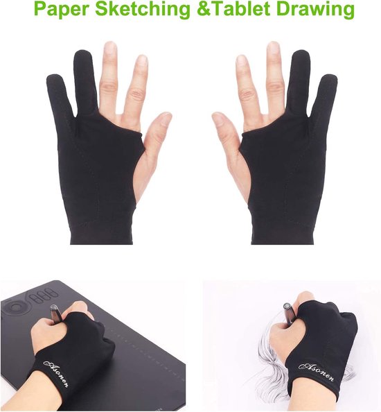 Perfekt für digitale Künstler! Diese Asonen Zeichenhandschuhe machen das Arbeiten am Grafiktablet so viel angenehmer. 2 Stück im Pack - für beide Hände oder als Ersatz. Dreischichtiges Design: Anti-Touch (verhindert versehentliche Berührungen), Anti-Schweiß (bleibst du cool) und fest sitzend (rutscht nicht). Aus weichem Lycra und Nylon - super dehnbar und atmungsaktiv. Größe: 8,9x20,3cm, passt für Männer und Frauen. Schwarz ist praktisch - sieht Schmutz nicht so schnell. Reduziert die Reibung deutlich, deine Hand gleitet smooth übers Tablet. Ob fürs Skizzieren, Kolorieren oder digitale Malerei - damit wird jedes Projekt zum Vergnügen. Auch gut für Lichtboxen oder traditionelles Zeichnen. Einfach anziehen und loslegen!