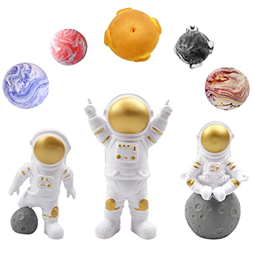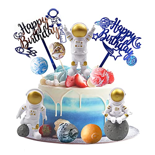 Enthalten sind: 1 Astronaut, 1 Mond, 1 Rakete, Planeten (Merkur, Jupiter), 5 silberne Kuchenkugeln, 5 goldene Kuchenkugeln und 10 Sterne. Einfach auf den Kuchen stellen und schon wird aus einer normalen Torte ein intergalaktisches Meisterwerk!
