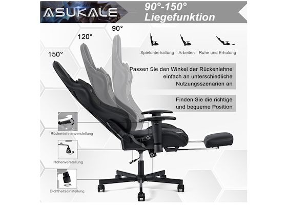 Zocker und Büroarbeiter, dieser Asukale Gaming Stuhl ist pure Bequemlichkeit! Der atmungsaktive Stoff fühlt sich an wie weicher Pelz - im Sommer kühl, im Winter warm. Die Rückenlehne lässt sich von 90° (Arbeitsmodus) bis 150° (Entspannung) verstellen. Mit der Gasdruckfeder stellst du die Höhe individuell ein. Die Armlehnen sind höhenverstellbar und drehbar - perfekt für lange Sessions! Inklusive Kopf- und Lendenkissen für optimalen Support. Der Clou: Die integrierte Fußstütze macht Relaxen zum Erlebnis. Montage in 10-15 Minuten erledigt. Egal ob beim Zocken oder Arbeiten - dein Rücken wird's dir danken!