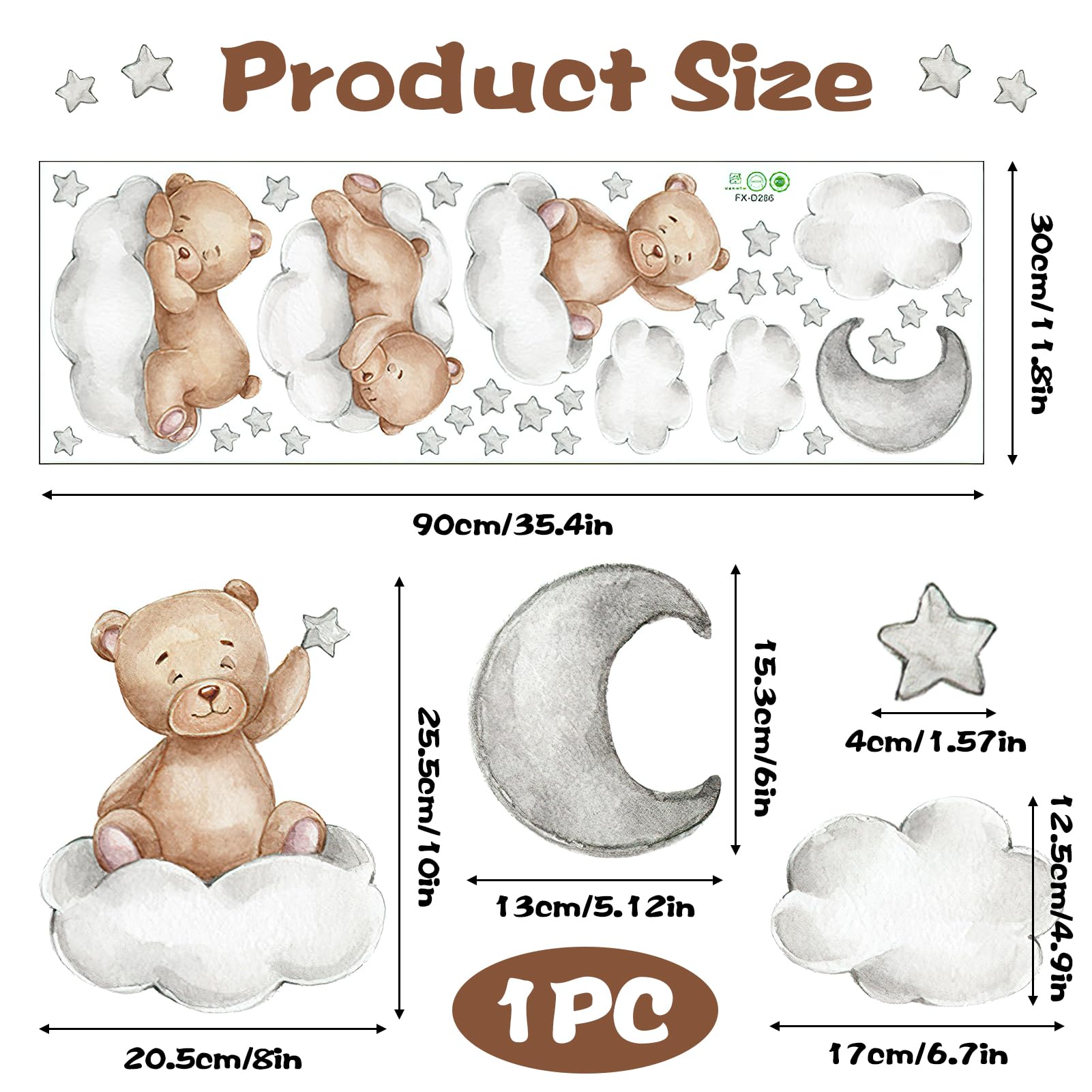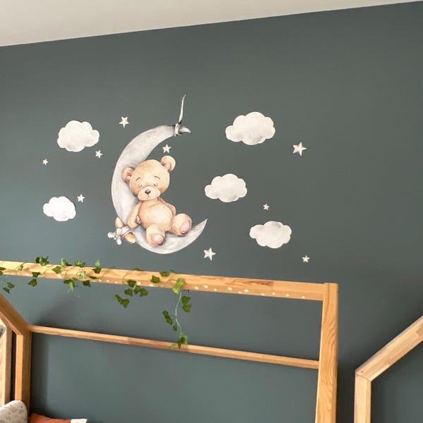 Verwandle das Kinderzimmer in eine Traumlandschaft! Dieser niedliche Wandsticker mit einem schlafenden Teddybären auf einer Wolke, umgeben von Sternen und einem lächelnden Mond, schafft eine magische Atmosphäre. Mit 90x30cm Größe ein echter Blickfang an der Wand. Aus hochwertigem, umweltfreundlichem PVC - geruchsneutral, wasserabweisend und absolut kindersicher. Einfach anzubringen und rückstandslos entfernbar. Fördert die Fantasie deines Kindes und sorgt für gemütliche Abendstunden. Perfekt für Jungen und Mädchen - ein ideales Geschenk zur Geburt oder zum Geburtstag. Mach das Kinderzimmer zum Lieblingsort deines Kleinen!