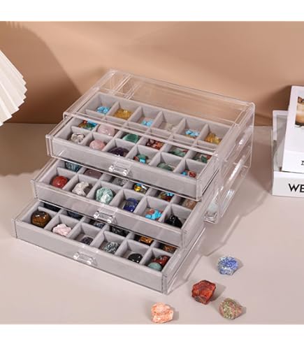 Präsentiere deine Schätze wie ein Profi in dieser stylischen 54-Fach Vitrine! Perfekt für Kristalle, Edelsteine, Fossilien, Muscheln oder Miniaturen. Mit 15,5 x 23,7 x 10,8 cm Größe bietet sie reichlich Platz für deine gesamte Sammlung. Die drei Ebenen mit transparenten Acryl-Deckeln ermöglichen einen freien Blick auf alle Stücke, während der samtige Innenbezug für optimalen Schutz sorgt. Super praktisch: Die Box ist auch als Reiseetui geeignet - so kannst du deine Lieblingsstücke sicher transportieren. Ob für zu Hause, als Geschenk für Sammler oder für die Mineralien-Ausstellung - diese Vitrine macht immer eine gute Figur! Die stabile Konstruktion schützt vor Staub und Beschädigungen, während das schlichte Design sich perfekt in jede Wohnung einfügt. Deine Sammlung verdient diese tolle Präsentation!