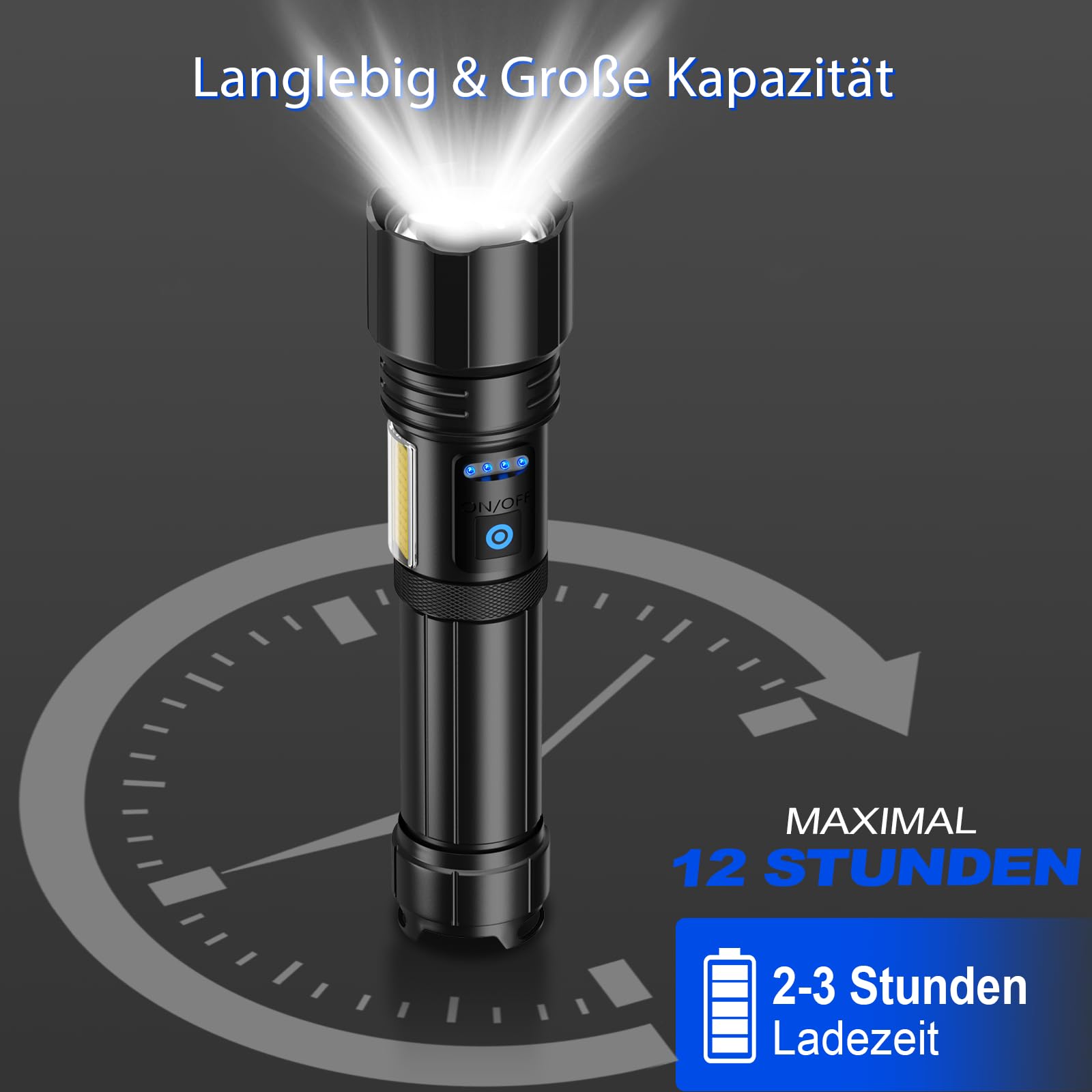 Boah, diese Taschenlampe ist richtig hell! Mit satten 500.000 Lumen und 5 Lichtmodi (Hoch, Mittel, Niedrig, Strobe, SOS) meisterst du jede Dunkelheit. Die Reichweite beträgt unglaubliche 1000 Meter! Aufladbar per USB in nur 3-4 Stunden, mit 5000mAh Akku für bis zu 15 Stunden Betrieb. Das IPX7 wasserdichte Gehäuse aus Aluminiumlegierung hält auch mal einen Sturz aus. 4 LED-Ladeanzeigen zeigen dir immer den Akkustand an. Perfekt für Camping, Wandern, Angeln oder als Notfall-Ausrüstung im Auto. Mit 2 Jahren Garantie - da kannst du beruhigt zuschlagen. Einfach aufladen und ab ins Abenteuer - diese Taschenlampe macht jede Nacht zum Tag!