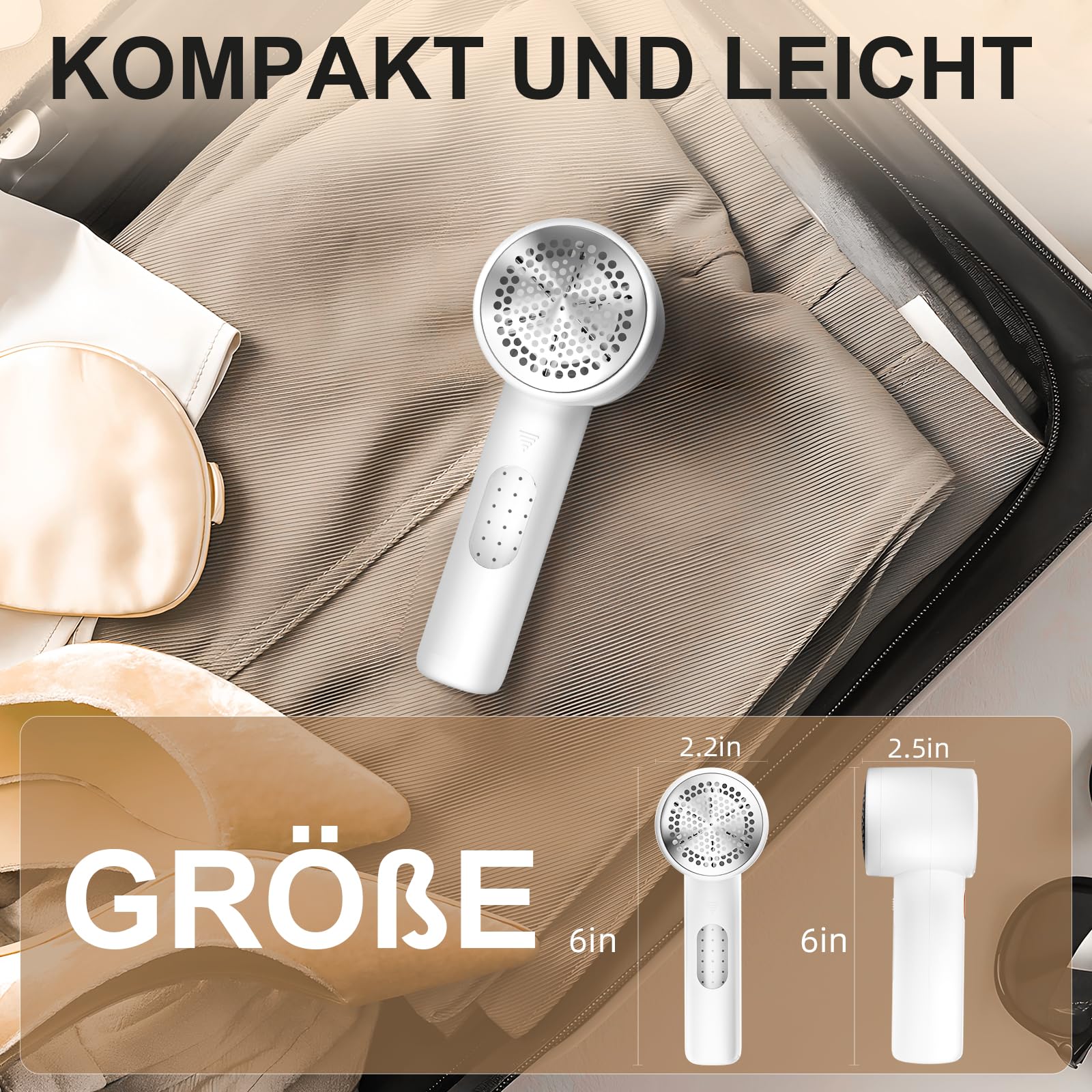 Mach deine Kleidung wieder wie neu! Dieser elektrische Fusselrasierer entfernt lästige Flusen, Knötchen und Fusseln von Pullovern, Decken, Sofas und allen möglichen Stoffen. Mit sechs scharfen Klingen und starkem Motor räumt er gründlich auf - in Sekundenschnelle siehst du den Unterschied! Der Akku lädt per USB-C in 1-2 Stunden voll und hält dann 1-1,5 Stunden durch. Besonders praktisch: Im Lieferumfang sind gleich zwei Ersatzklingen dabei, plus Reinigungsbürste. Die transparente Staubbox zeigt dir, wann sie geleert werden muss. Das ergonomische Design liegt super in der Hand und der Sicherheitsmechanismus schützt dich und deine Kleidung. Einfach einschalten und über die betroffenen Stellen führen - schon sieht alles wieder frisch und gepflegt aus. Ein Must-Have für jeden Haushalt!