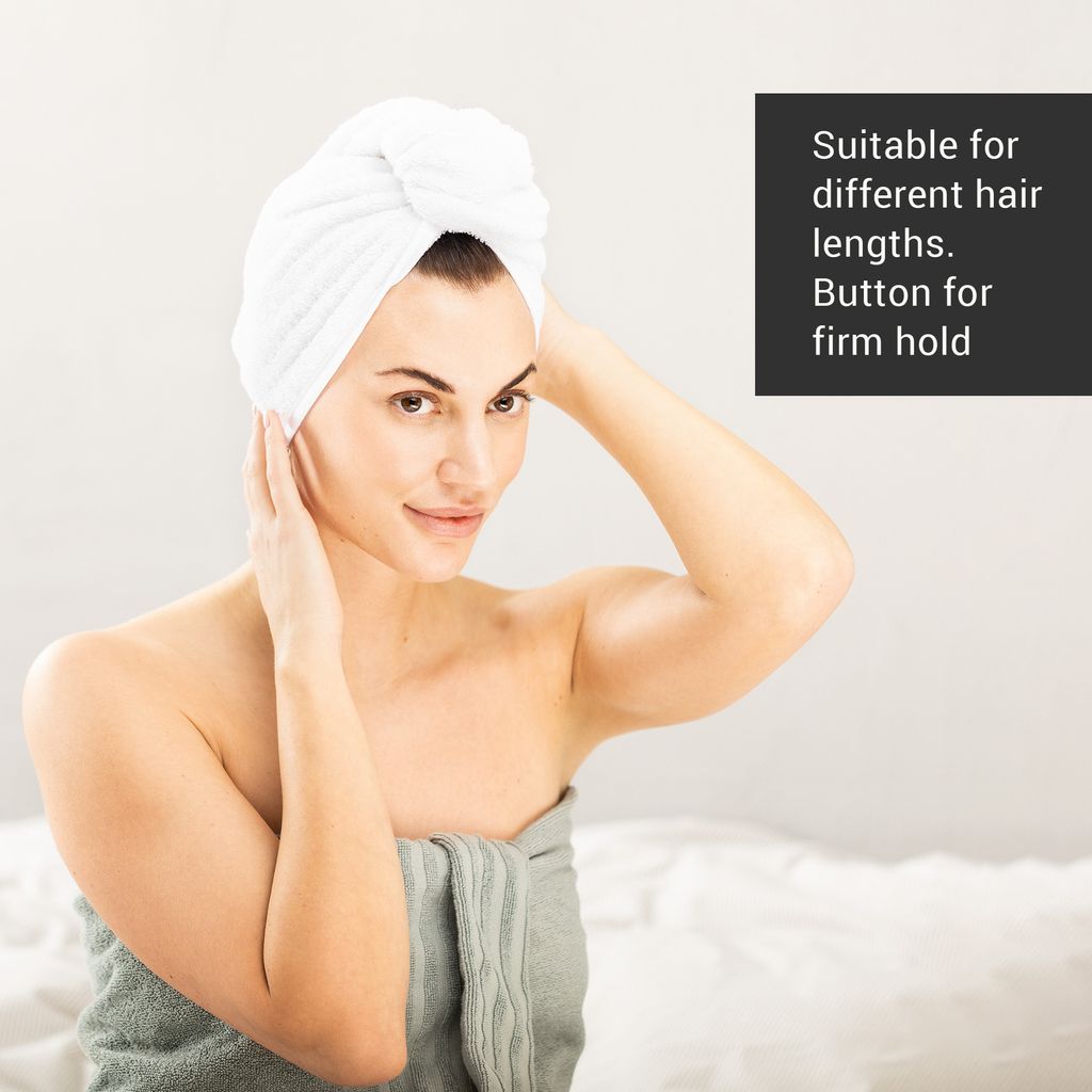 Nasses Haar? Kein Problem mit diesem Haarturban aus 100% Baumwolle! Super saugstark nimmt er die Feuchtigkeit im Handumdrehen auf - viel besser als ein normales Handtuch. Der praktische Knopf macht das Binden ganz einfach - kein kompliziertes Wickeln mehr nötig! Besonders sanft zur Kopfhaut und ideal für empfindliches Haar. Bekämpft krauses Haar und lässt deine Haare natürlich trocknen, ohne sie zu strapazieren. Falbar und leicht passt er in jede Handtasche - perfekt für unterwegs, Fitnessstudio, Sauna oder Urlaub. Nach dem Gebrauch trocknet er superschnell und ist sofort wieder einsatzbereit. In verschiedenen Farben erhältlich - da findest du sicher deinen Favoriten! Ein echtes Multitalent für die Haarpflege-Routine. Damit werden deine Haare nicht nur schneller trocken, sondern sehen auch viel gesünder aus. Einfach praktisch und stylisch zugleich!