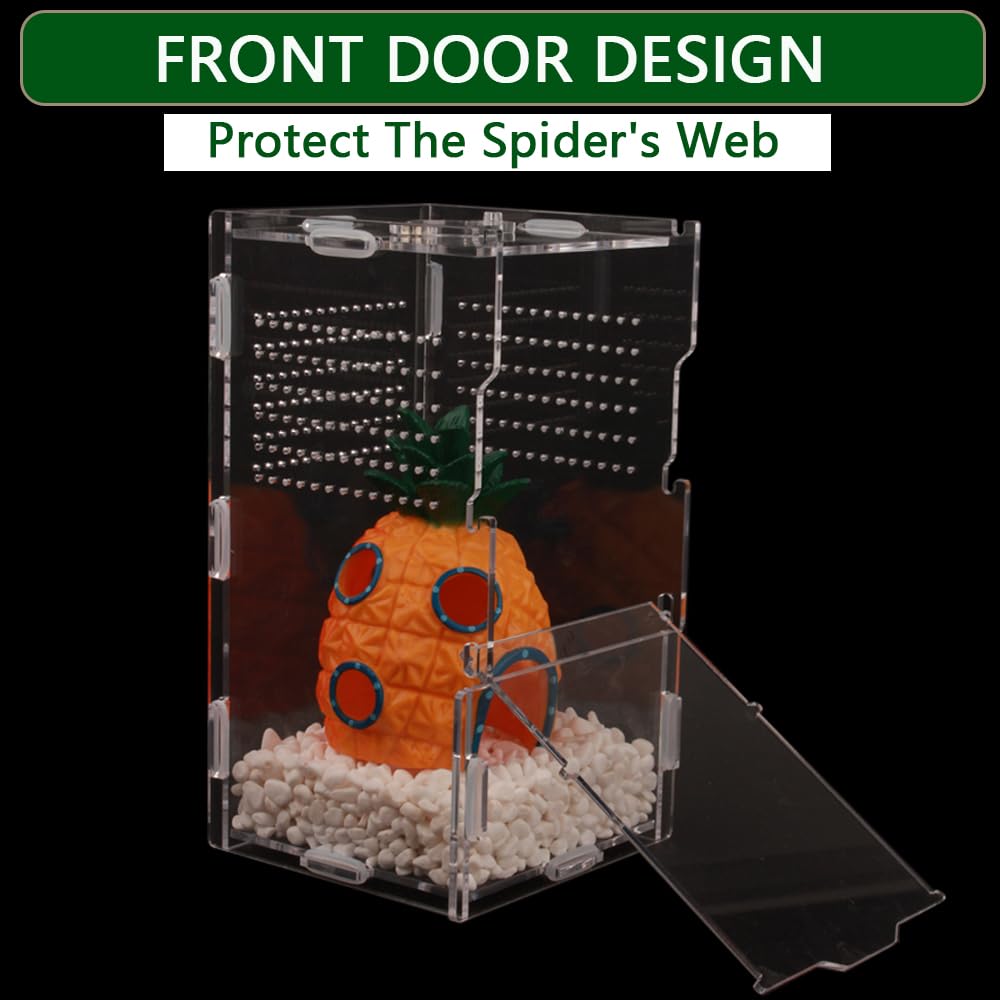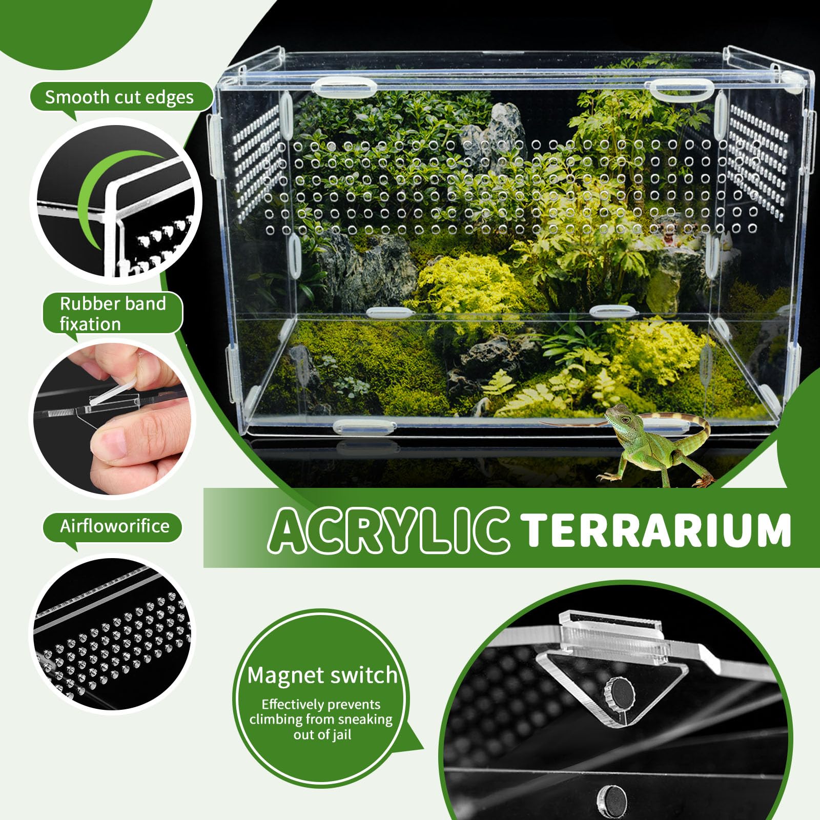 Das perfekte Zuhause für deine Springspinne! Dieses Acryl-Terrarium mit 8x8x14 cm ist ideal für Springspinnen, kleine Vogelspinnen, Gottesanbeterinnen und andere kleine Krabbler. Die magnetische Fronttür macht die Fütterung super einfach und verhindert gleichzeitig Ausbrüche. Die Belüftungslöcher sorgen für frische Luft ohne dass dein Tierchen entkommen kann. Das schräge Dach fördert das natürliche Webverhalten. Kristallklare Sicht von allen Seiten - perfekt zum Beobachten! Einfach zusammenzustecken, kein Werkzeug nötig. Passt gut auf Schreibtisch oder Regal. Mit dabei: Gehäuse, Gummibänder und Anleitung. Achtung: Nicht für große Reptilien oder ausgewachsene Vogelspinnen geeignet. Ein tolles Geschenk für Spinnen-Fans!