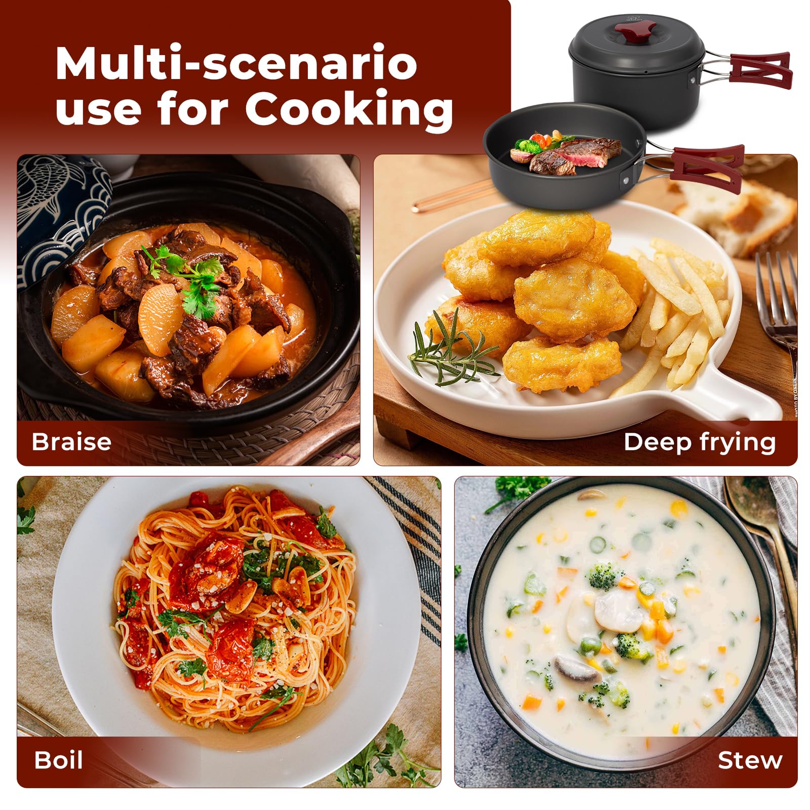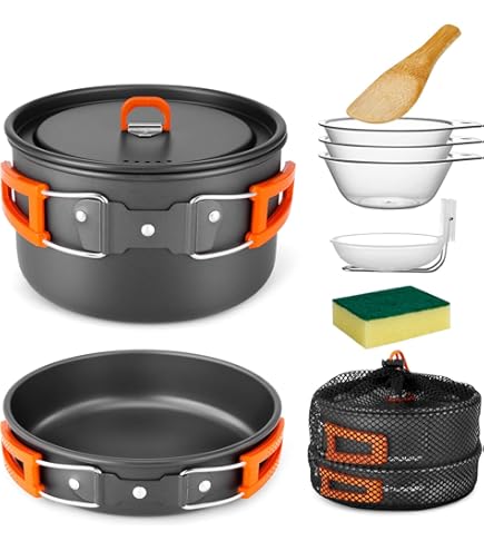 Perfekt für dein nächstes Outdoor-Abenteuer! Dieses 8-teilige Aluminium-Kochset ist super leicht und packt klein zusammen. Enthält Topf, Pfanne, Teekanne (800 ml), 2 Edelstahlbecher und Besteck (Löffel, Gabel, Cutter). Alles sicher verpackt in einer praktischen Tragetasche. Die hitzebeständigen Griffe schützen deine Hände, und das Anti-Rutsch-Design gibt dir einen festen Halt. Ideal für Camping, Wandern oder Picknick mit Freunden oder Familie. Robust und langlebig, aber trotzdem leicht - genau das, was du unterwegs brauchst. Einfach aufbauen, loskochen und die Natur genießen!