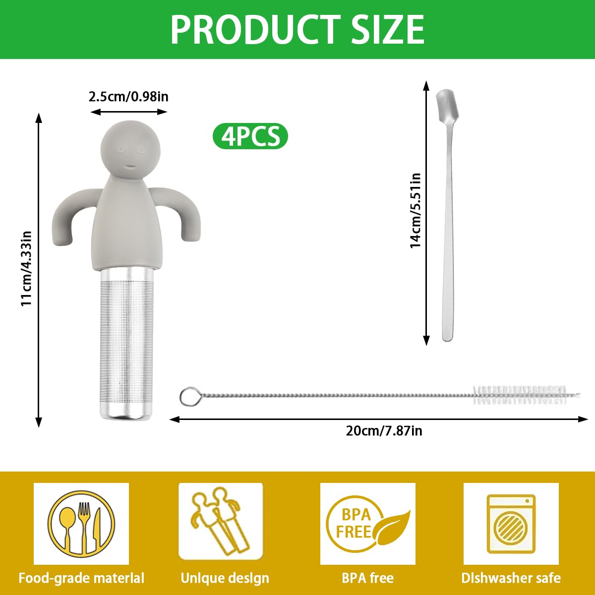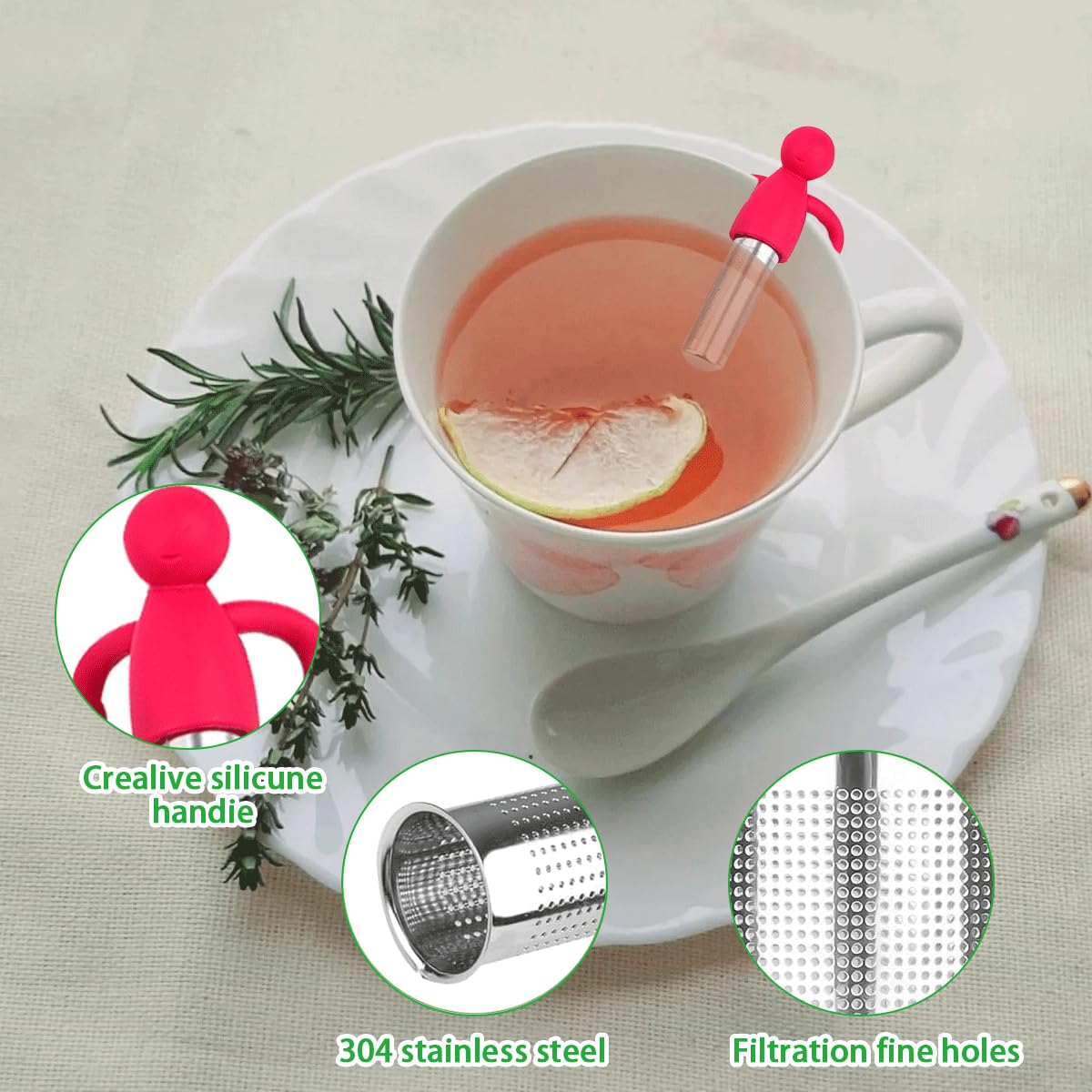 Dieses niedliche Teesieb-Set macht die Tee-Zeit zum Vergnügen! Die Siebe sind in Form eines lächelnden Männchens gestaltet und sehen total witzig aus. Aus lebensmittelechtem Edelstahl gefertigt, sind sie rostfrei und langlebig. Der feine Filter (0,5 mm) hält selbst kleine Teeblätter zurück, sodass dein Tee klar und lecker wird. Der lange Stiel mit Silikongriff verhindert, dass du dir die Finger verbrennst. Einfach Tee einfüllen, in die Tasse hängen und mit heißem Wasser aufgießen. Im Set sind 4 Siebe in verschiedenen Farben, ein Löffel und eine Bürste enthalten - perfekt für dich oder als Geschenk für Teeliebhaber!