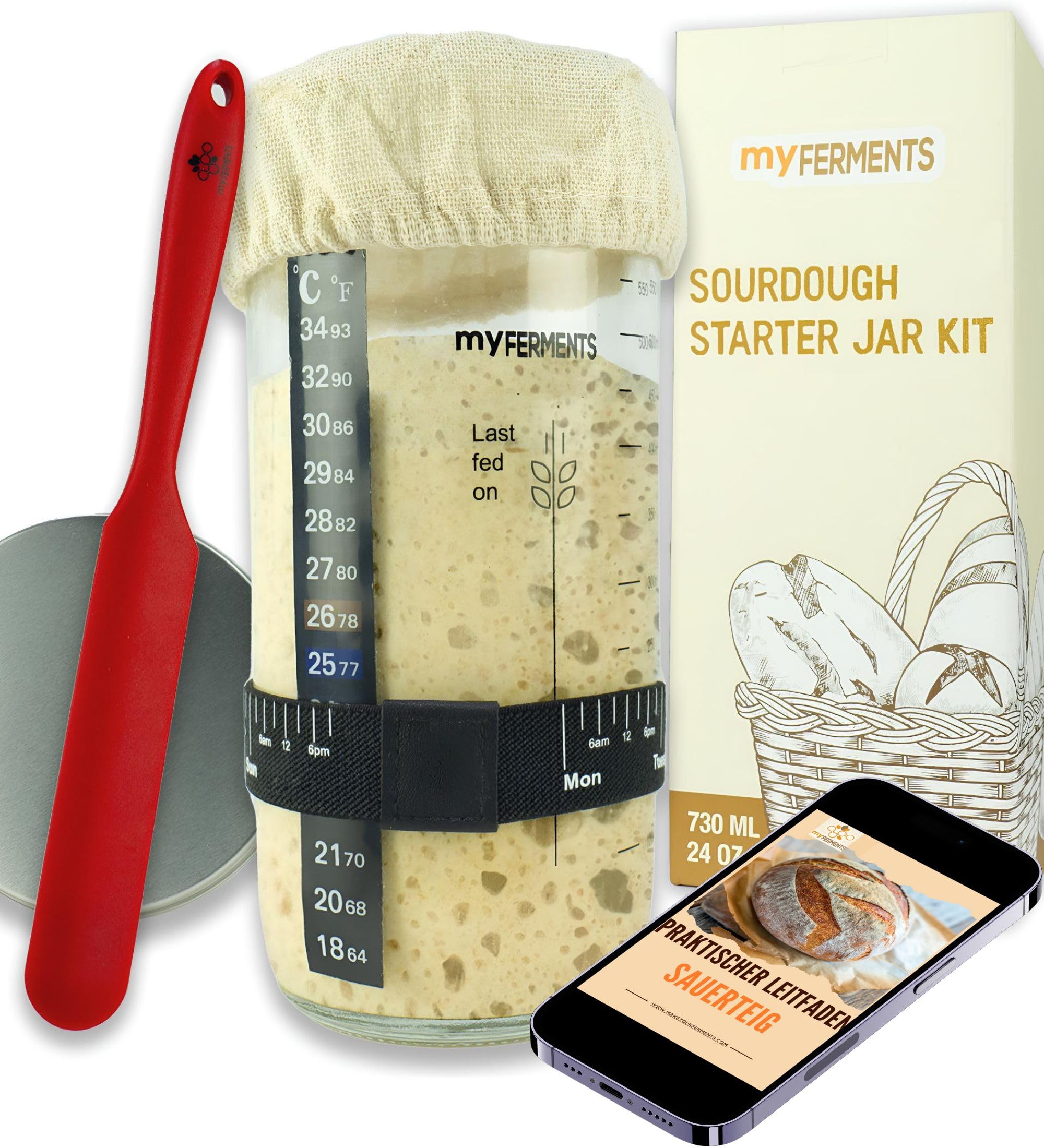 Mit diesem Sauerteig-Starter-Set kannst du sofort loslegen mit dem Brotbacken - auch wenn du noch nie zuvor Sauerteig angefasst hast! Das Komplett-Set enthält alles, was du brauchst: Ein 1000ml Fermentationsglas aus Glas, Thermometer, Spatel, Stoff- und Metalldeckel, Messbecher, Gummiband und eine easy-to-follow Anleitung. Alles plastikfrei und nachhaltig verpackt, wie es sich für bewusste Haushalte gehört. Der praktische Gär-Tagesring am Glas zeigt dir genau, wo dein Sauerteig steht - so geht nichts schief. Perfekt für Einsteiger, aber auch Profis werden die hochwertigen Materialien zu schätzen wissen. Alles ist spülmaschinenfest und kann immer wieder verwendet werden. Mach dein eigenes, gesundes Brot ohne Zusatzstoffe - frischer und leckerer geht's nicht! Super als Geschenk für alle, die auf Qualität und traditionelles Backen stehen. Einfach ausprobieren - du wirst überrascht sein, wie einfach das geht!