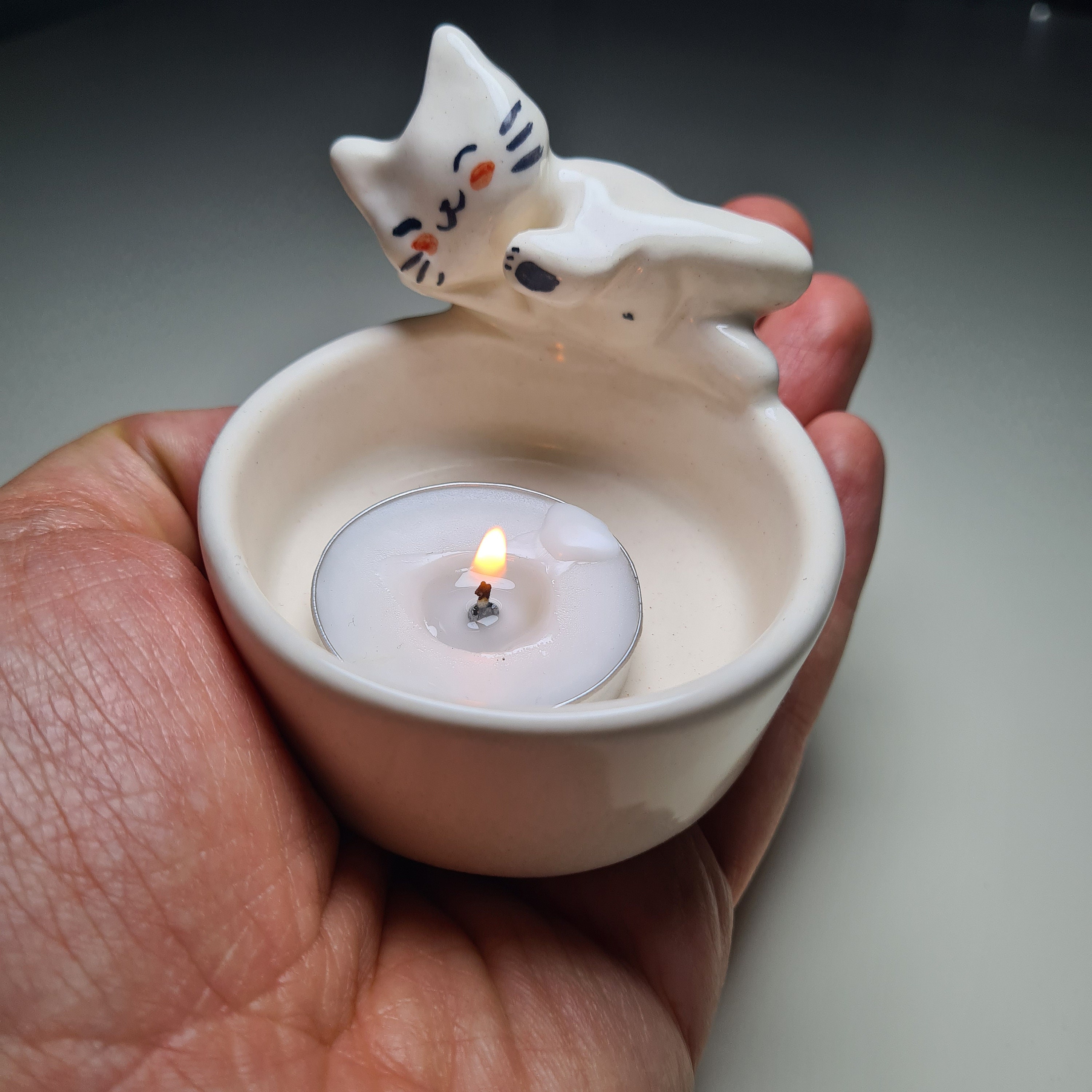 Oh, wie niedlich! Dieser Katzen-Kerzenhalter aus hochwertigem Harz ist einfach unwiderstehlich. Die kleine Katze wärmt sich mit ihren Pfötchen an der Kerze - ein Design, das einfach gute Laune macht! Aus robustem Harz gefertigt, ist der Kerzenständer langlebig und stabil. Er passt perfekt auf den Couchtisch, Nachttisch, Bücherregal oder Kaminsims und verbreitet sofort eine gemütliche Atmosphäre. Ob im Wohnzimmer, Schlafzimmer oder Büro - überall sorgt er für Charme und Wärme. Perfekt für Katzenliebhaber und alle, die es gemütlich mögen. Ein tolles Geschenk für Geburtstage, Weihnachten oder einfach mal so als Aufmerksamkeit. Die weiße Farbe passt zu jedem Einrichtungsstil und die Kerze in Standardgröße brennt sicher in dem Halter. Einfach die Kerze anzünden und den beruhigenden Schein genießen - das ist pure Gemütlichkeit für Zuhause! Ein Must-Have für alle, die Katzen lieben und es sich gerne behaglich machen.
