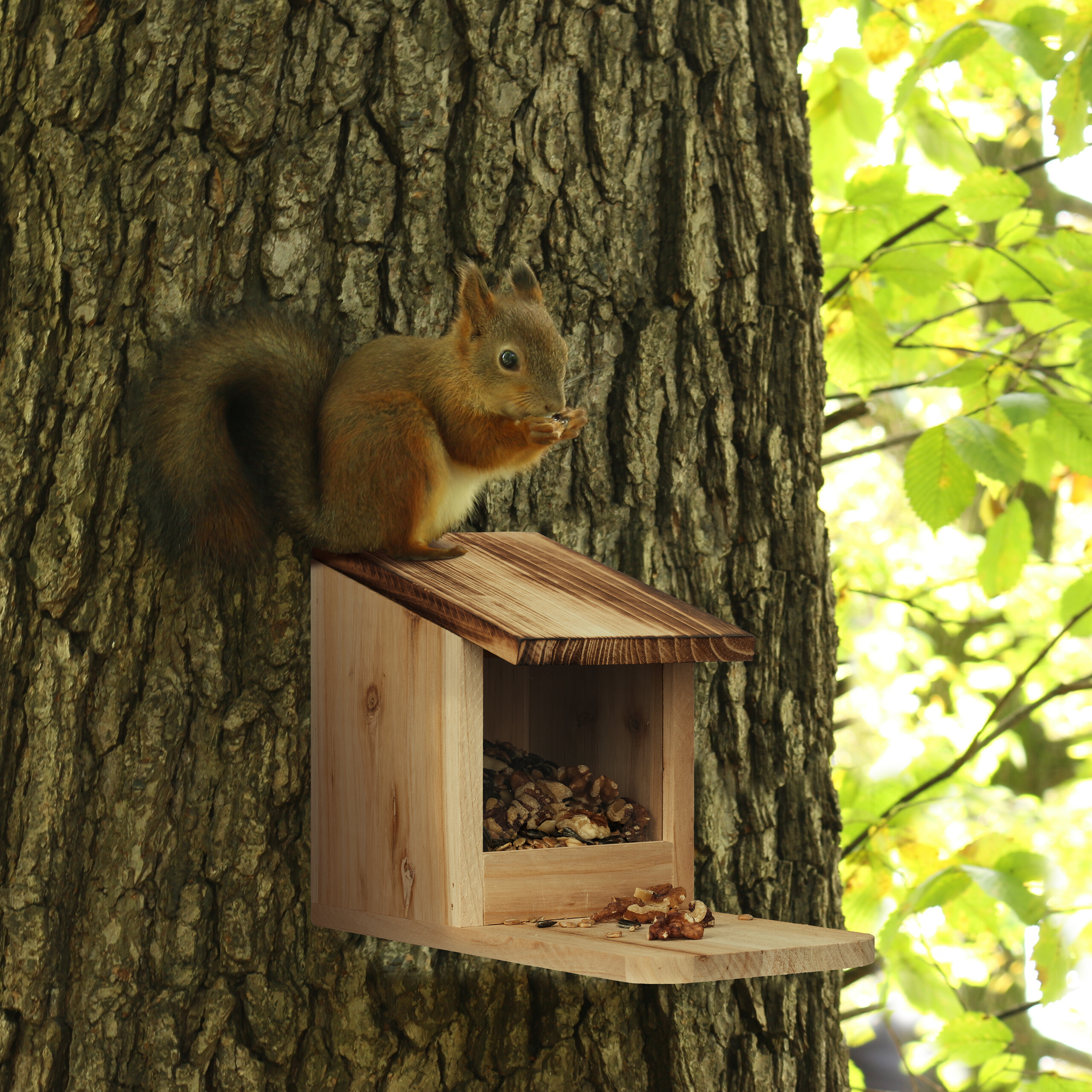 Hol dir die niedlichen Eichhörnchen in deinen Garten! Dieses robuste Futterhaus aus massivem Holz ist der perfekte Futterplatz für die flinken Kletterer. Einfach an einem Baumast oder Balkongeländer befestigen, mit Haselnüssen, Walnüssen oder Eicheln füllen - und schon kannst du das muntere Treiben beobachten. Besonders Kinder sind begeistert, wenn sie die Eichhörnchen aus nächster Nähe beim Knabbern beobachten können. Das wetterfeste Design hält Regen, Wind und Kälte stand und ist damit ganzjährig einsetzbar. Made in EU - für qualitativ hochwertige Handwerksarbeit. Ob auf der Terrasse, im Garten oder am Balkon - dieses Futterhaus ist nicht nur praktisch, sondern auch eine dekorative Bereicherung. Unterstütze die Tierwelt in deiner Umgebung und erlebe faszinierende Naturmomente direkt vor deiner Haustür. Ein wunderbares Geschenk für alle Garten- und Tierfreunde!