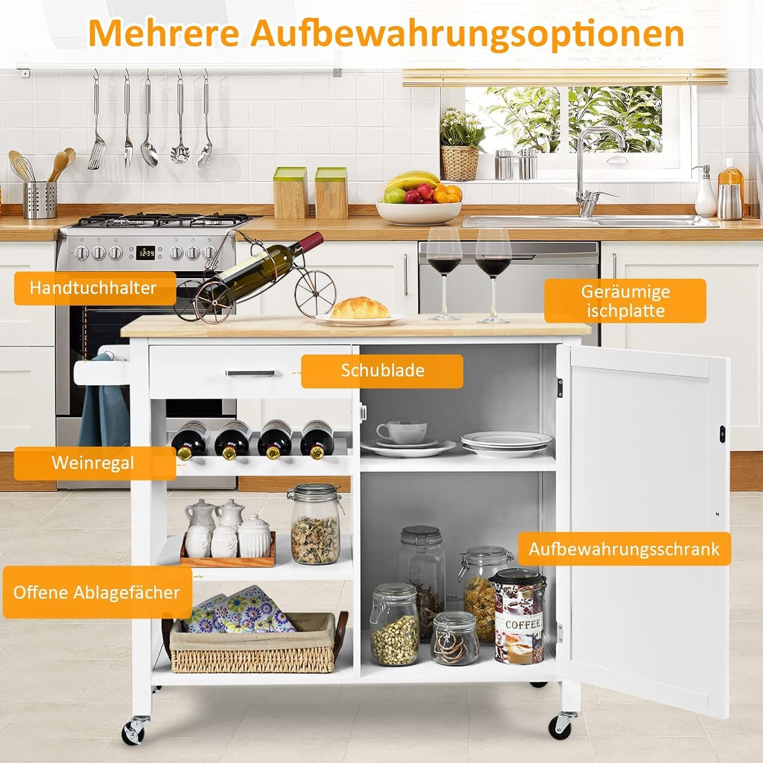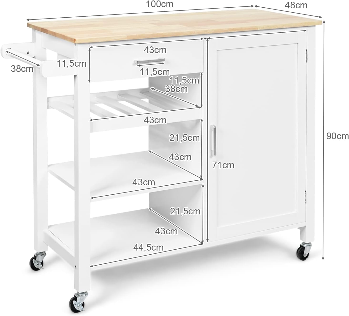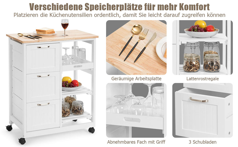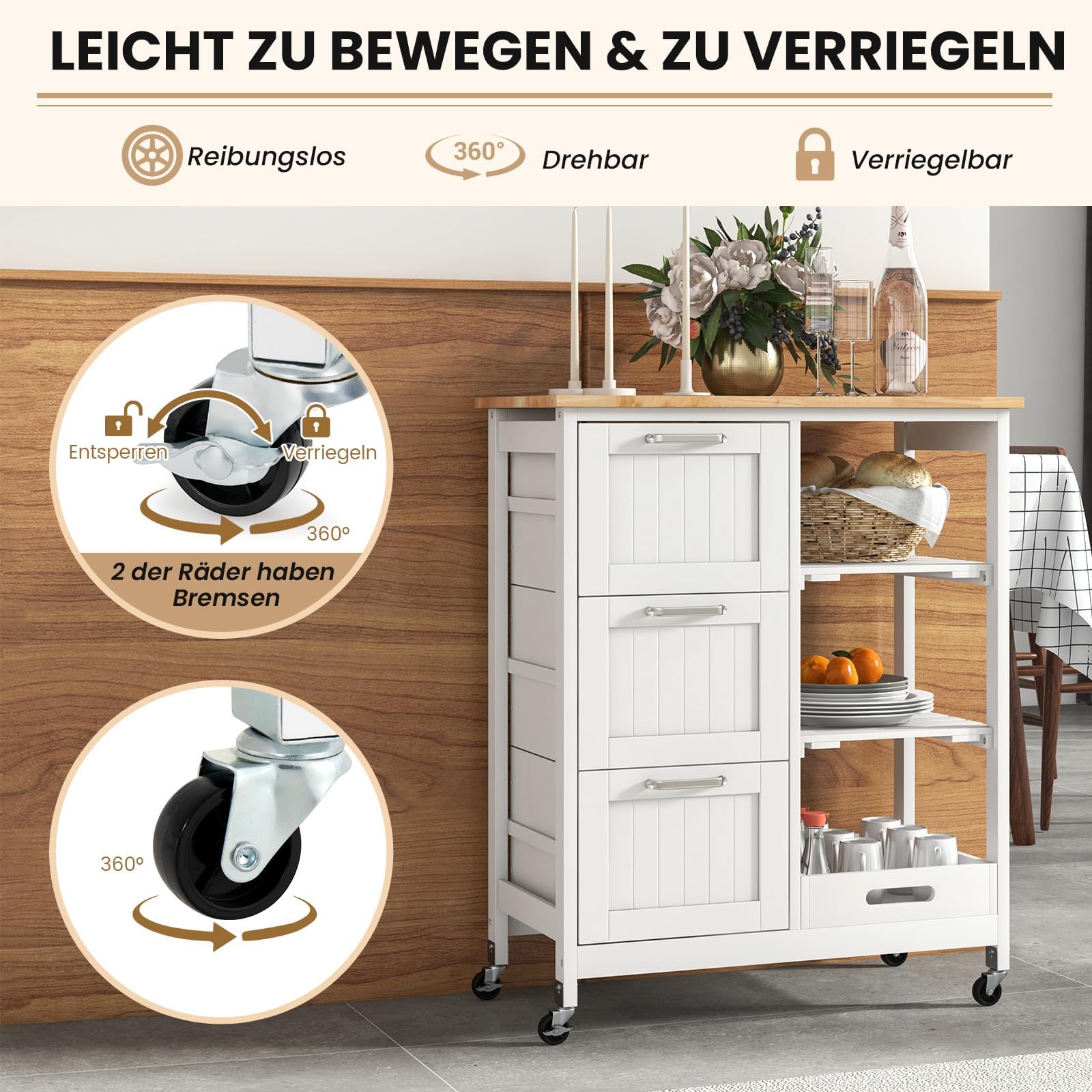 Bring Ordnung in deine Küche mit diesem vielseitigen Küchenwagen von FANTASK! Mit den Maßen 67x37x82,5 cm bietet dieser mobile Organizer reichlich Stauraum und Arbeitsfläche. Hergestellt aus robustem Kautschukholz, Kiefernholz und MDF-Platten, ist dieser Wagen extrem stabil und hält einer Belastung von bis zu 61 kg stand. Die umweltfreundliche NC-Lackierung sorgt für eine glatte, pflegeleichte Oberfläche ohne unangenehme Gerüche. Besonders praktisch: 3 große Schubladen für Küchenutensilien, 2 offene Regalfächer und ein herausnehmbares Tablett bieten unendlich viele Aufbewahrungsmöglichkeiten. Die 4 um 360° drehbaren Lenkrollen (2 mit Bremse) machen den Transport zum Kinderspiel. Ob als Kücheninsel, Servierwagen, Barwagen oder Aufbewahrungsmöbel - dieses vielseitige Möbelstück passt sich deinen Bedürfnissen an. Der moderne, weiße Look harmoniert mit jeder Einrichtung und verwandelt deine Küche in einen organisierten Traum!