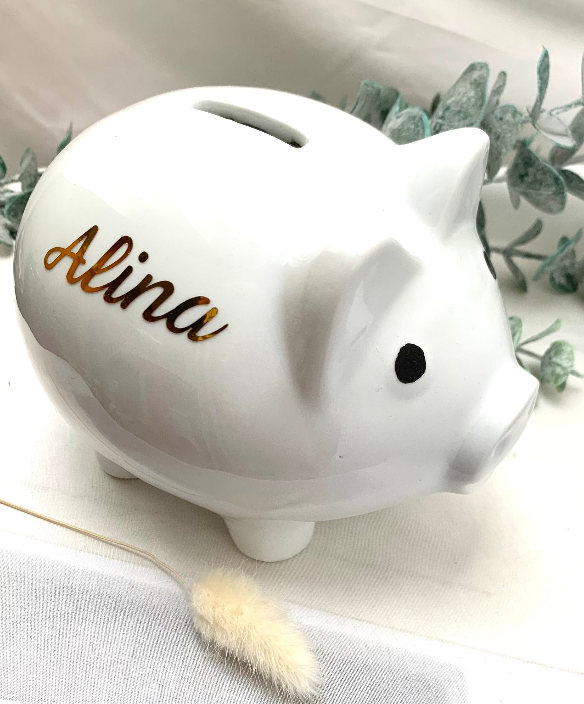 Wie süß ist das denn? Dieses personalisierte Sparschwein wird zum neuen besten Freund deines Kindes! Mit dem eigenen Namen drauf macht Sparen gleich doppelt Spaß. \\n\\nWas dieses Sparschwein so besonders macht: \\n• Personalisierbar mit Namen - einzigartiges Geschenk \\n• Robuster Kunststoff - hält auch mal einen Sturz aus \\n• Einfacher Münzeinwurf - kinderleicht zu bedienen \\n• Praktischer Knopf unten - Geld rausholen ohne Werkzeug \\n\\nGrößen zur Auswahl: \\n• S: 10 x 8 x 9,2 cm - perfekt für kleine Hände \\n• M: 13 x 10 x 11,5 cm - der Klassiker \\n• L: 15 x 12 x 13,5 cm - für große Sparer \\n\\nIdeal für: \\n• Kinder von 2-6 Jahren \\n• Geburtstagsgeschenke \\n• Weihnachtsgeschenke \\n• Zur Einschulung oder Babyparty \\n\\nDer Name wird per Laser graviert - hält ewig und blättert nicht ab. So lernen Kinder spielerisch den Umgang mit Geld und haben noch dazu riesigen Spaß dabei! \\n\\nTipp: Perfekt als Geschenk von Oma und Opa - mit persönlicher Note!
