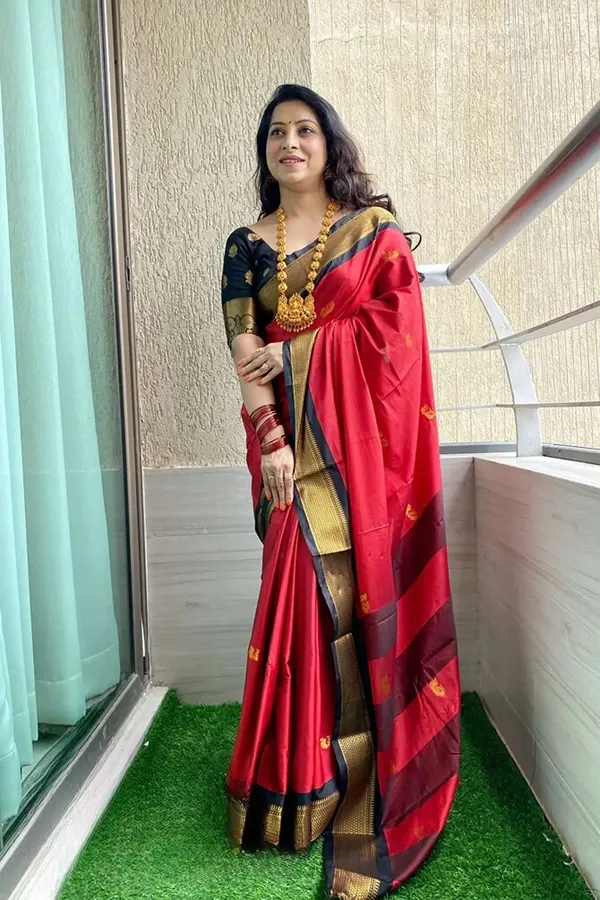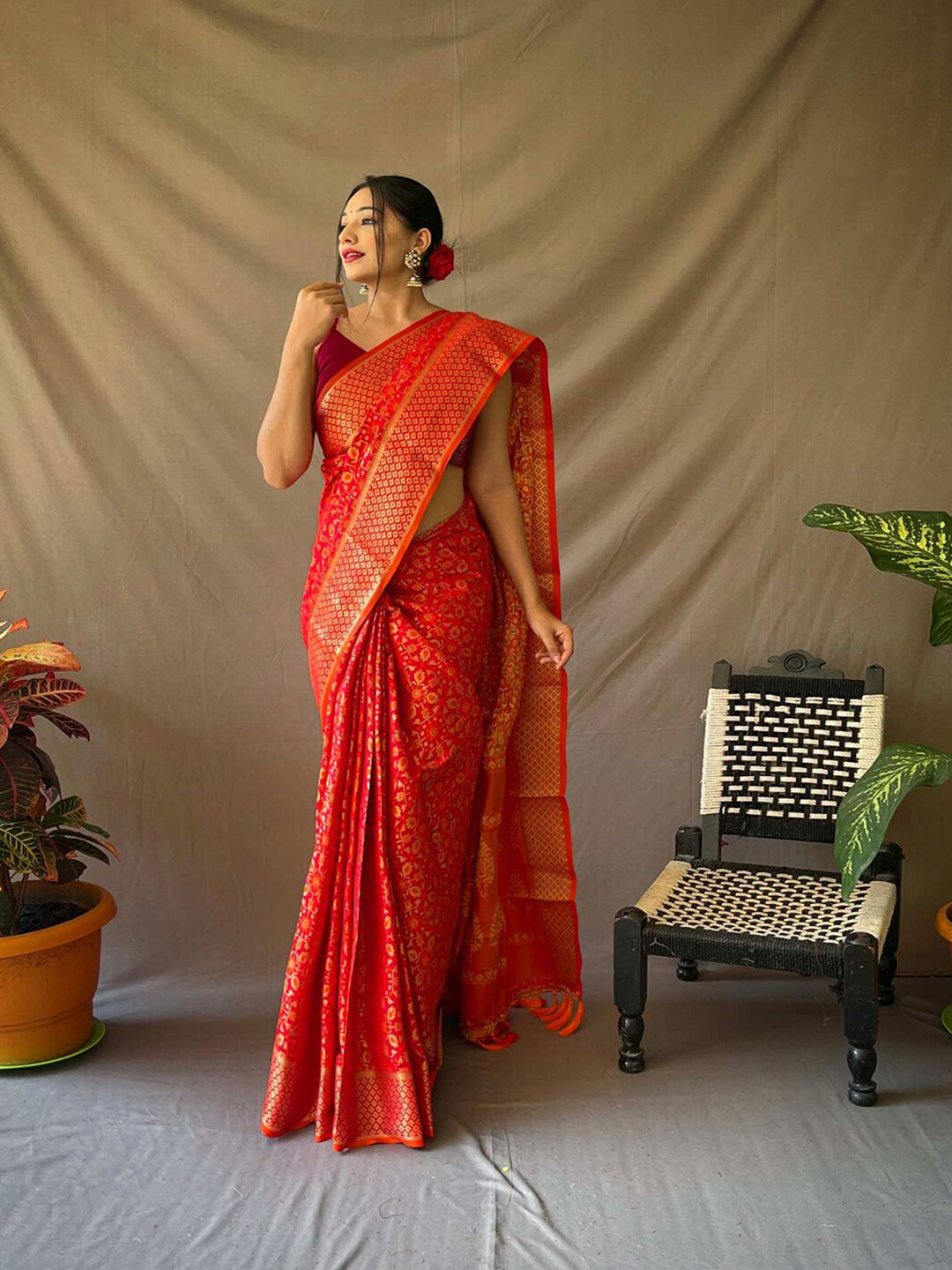 Wow, dieser Kanjivaram Sari von SGF11 ist einfach atemberaubend! Aus weicher Kupferseide gefertigt, fühlt er sich nicht nur luxuriös an, sondern sieht auch noch fantastisch aus. In einem strahlenden Orange ist er ein echter Hingucker. Der Sari hat eine Länge von 5,50m und wird komplett mit einem 0,80m langen Blusenteil geliefert - alles aus hochwertiger Kanchipuram-Seide. Mit Jacquard Webarbeit und Zari-Verzierungen ist er ein Meisterwerk traditioneller Handwerkskunst. Perfekt für Hochzeiten, Feste, besondere Anlässe oder wenn du einfach nur glamourös aussehen willst. Die weiche Oberfläche macht ihn angenehm zu tragen und einfach zu transportieren. In One-Größe passt er den meisten Frauen. Ein absolutes Must-have für jede modebewusste Frau, die ihren Stil unterstreichen möchte. Sieh unwiderstehlich aus mit diesem traumhaften Sari!