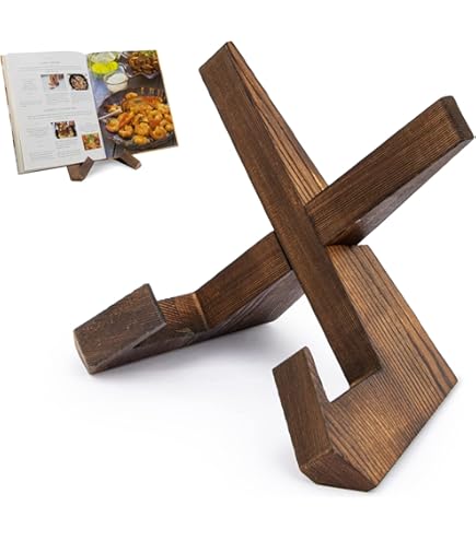 Endlich beide Hände frei beim Kochen! Dieser rustikale Kochbuchständer aus Massivholz hält deine Rezepte sicher fest. Sieht nicht nur gut aus, sondern ist auch super praktisch!