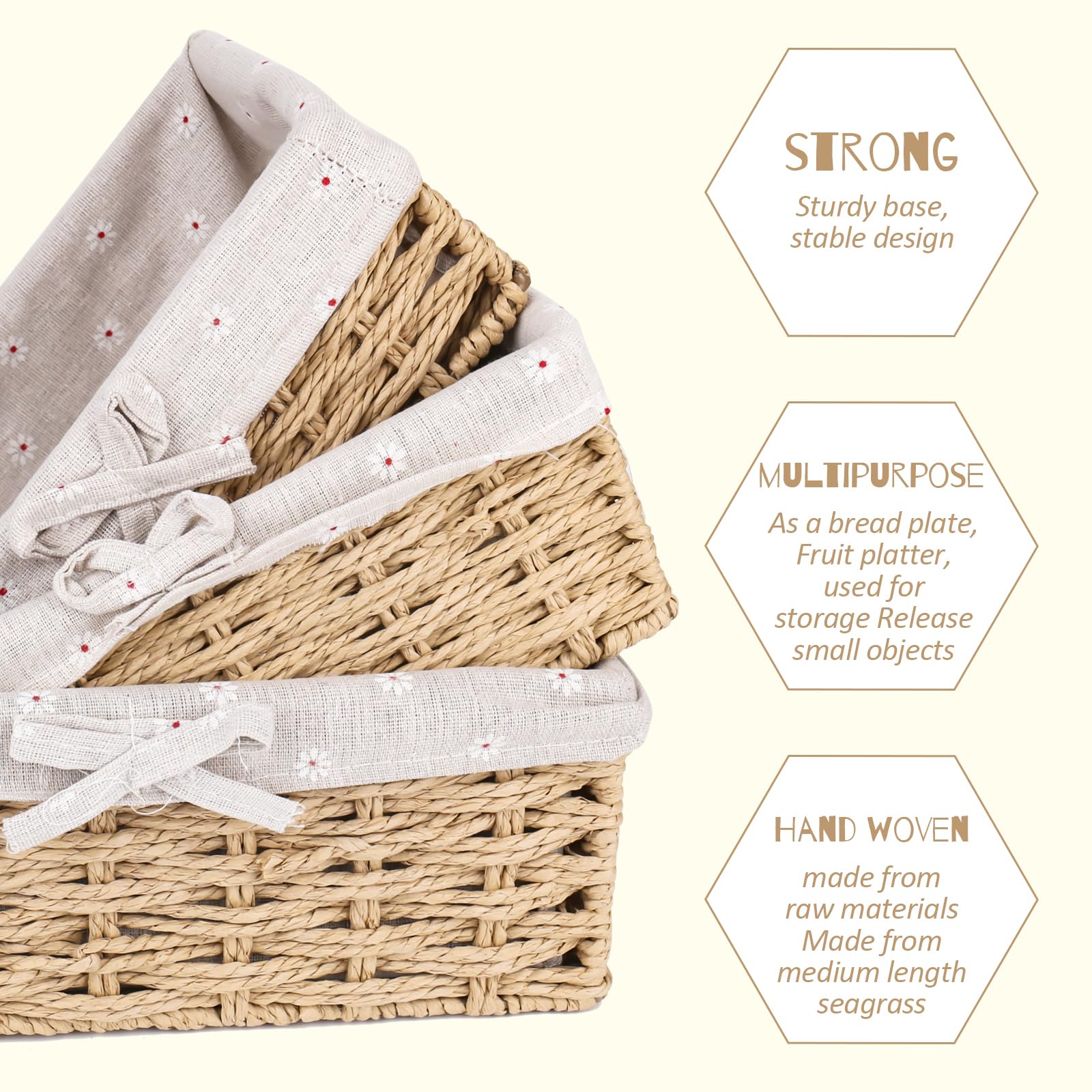 Hey, dieses richtig praktische 3er-Set Brotkörbe ist total vielseitig! Die Körbe sind handgeflochten aus natürlichem Seegras und sehen nicht nur super aus, sondern sind auch mega stabil. Perfekt für frisches Brot, Brötchen vom Bäcker oder auch Obst und Gebäck. Und weißt du was das Beste ist? Jeder Korb hat ein abnehmbares Leinen-Innenfutter - das kannst du einfach rausnehmen und waschen, total unkompliziert! Die drei Größen (18x12x8,5cm, 22x16x10cm, 26x20x12cm) passen für eigentlich alles - ob in der Küche, im Wohnzimmer oder sogar im Bad für Kleinigkeiten. Super als Geschenk für Foodies oder zur Deko! Die beige Farbe passt in jede Einrichtung und die Metallböden machen die Körbe extra robust. Ob fürs tägliche Frühstück, gemütliche Kaffeerunden oder besondere Anlässe - mit diesen Körben wird alles gleich viel gemütlicher! Und wenn du mal Platz sparen willst: Die Teile lassen sich einfach stapeln. Echt praktisch, oder?