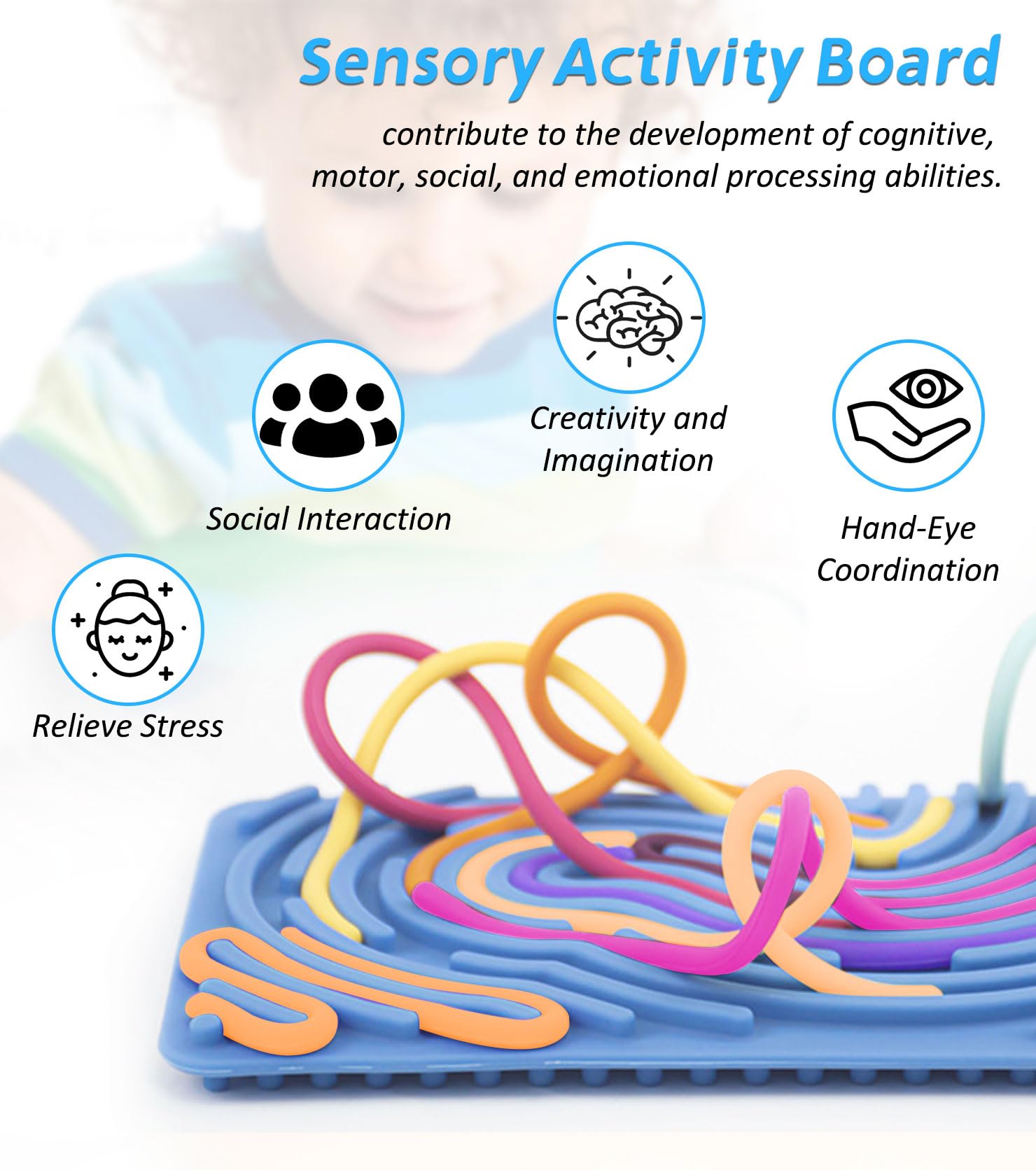 Beruhigung für unruhige Hände! Dieses sensory Activity Board aus weichem Silikon ist perfekt für Kinder und Erwachsene, die sich gerne beschäftigen. Mit 11x17cm Größe passt es in jede Tasche und ist ideal für unterwegs. Das doppelseitige Design bietet verschiedene Motive und 24 bunte Silikonstreifen laden zum Spielen ein. Absolut sicher - gratfrei, geruchsneutral und weich auf der Haut. Fördert die Hand-Augen-Koordination, Konzentration und Feinmotorik. Super für Kinder mit ADHD oder Autismus, aber auch für gestresste Erwachsene, die einfach mal abschalten möchten. Perfekt für Wartezimmer, Autofahrten, Flugreisen oder einfach zu Hause auf dem Sofa. Im Set inklusive Kordelzugbeutel für hygienische Aufbewahrung. Ein kleines Wunder für mehr Entspannung im Alltag!