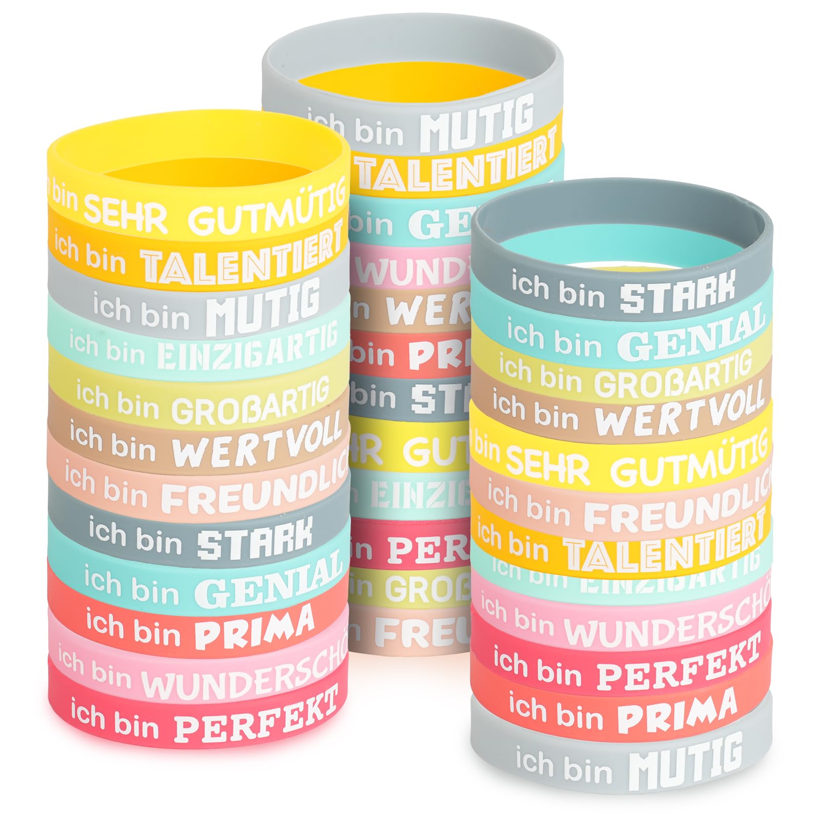 Kleine Armbänder, große Wirkung! Dieses Set mit 30 bunten Motivationsarmbändern gibt den täglichen Energie-Kick. Mit coolen Sprüchen wie 'Beharren ist Sieg' oder 'Du hast 99 Schritte gemacht'. Aus weichem, hautfreundlichem Silikon - super bequem zu tragen. Perfekt für Schüler, Sportler oder als Mitgebsel auf Kinderpartys. Jedes Armband ist elastisch und passt sich jedem Handgelenk an. Ob einzeln oder gestapelt - sie sehen immer trendy aus. Gib deinen Liebsten täglich neue Motivation oder mach dich selbst stolz auf deine Erfolge. Ein Geschenk, das wirklich unter die Haut geht - im positiven Sinne!