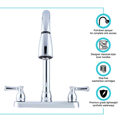 Dein Wohnmobil oder Camper braucht ein Upgrade in der Küche? Diese Dura Faucet Armatur macht deine Küche sofort moderner und praktischer! Mit ausziehbaren Sprühkopf kannst du die Spüle ganz einfach reinigen und zwischen Strahl und Sprühfunktion wechseln. Die zwei Griffe geben dir perfekte Kontrolle über Wassertemperatur und Durchfluss. Mit 37,2cm Höhe und 34,1cm Breite passt sie perfekt in die beengten Verhältnisse eines Wohnmobils. Die einfache 3-Loch-Installation macht den Einbau zum Kinderspiel - selbst wenn du nicht der größte Handwerker bist. Aus hochwertigen Materialien gefertigt und bleifrei, dazu UPC und CUPC zertifiziert für maximale Sicherheit. Die tropffreie Kartusche sorgt dafür, dass kein wertvolles Wasser verschwendet wird. Verleihe deinem mobilen Zuhause mit dieser Armatur einen frischen, modernen Look - du wirst staunen, was für einen Unterschied so eine kleine Veränderung machen kann!