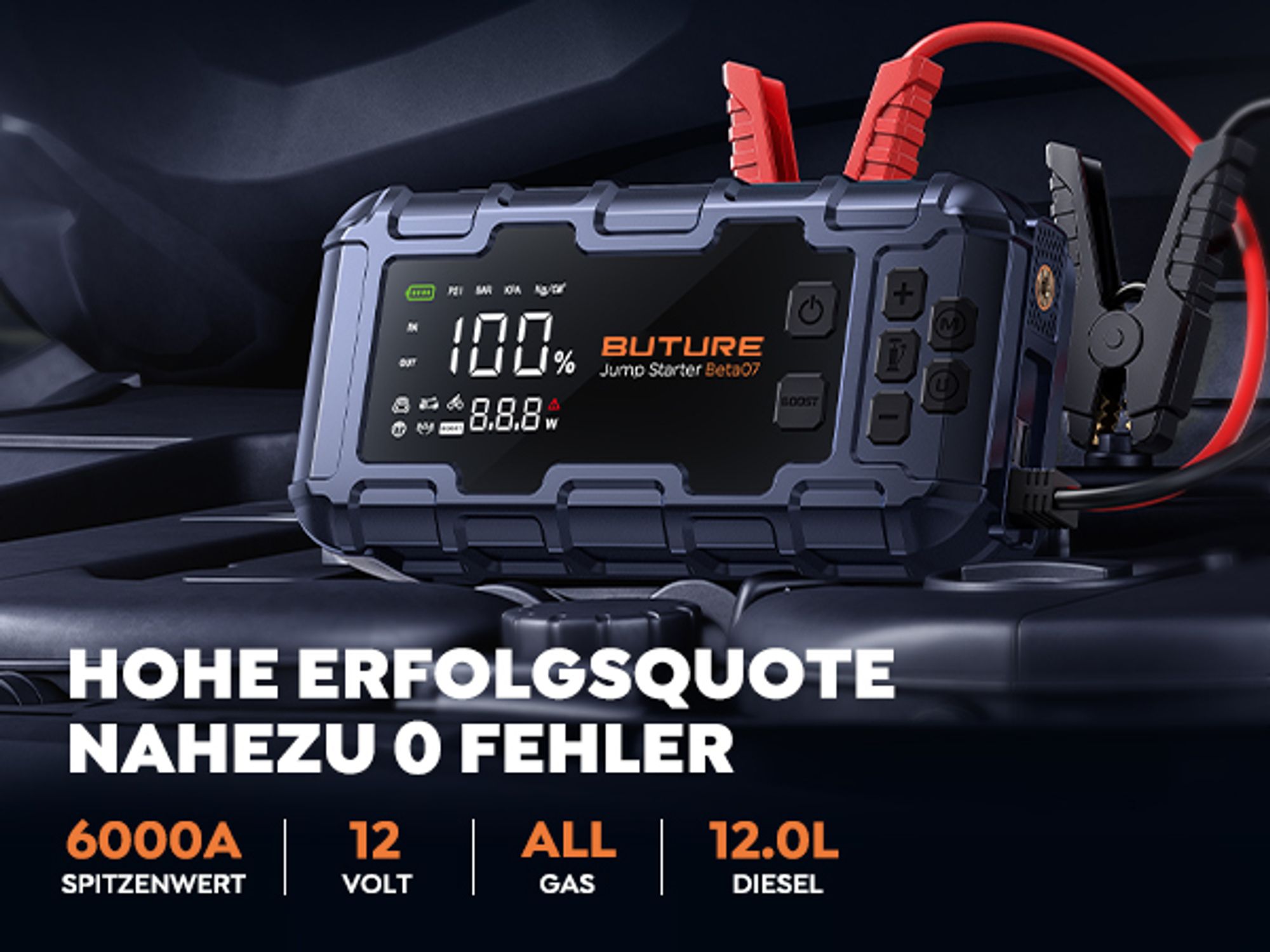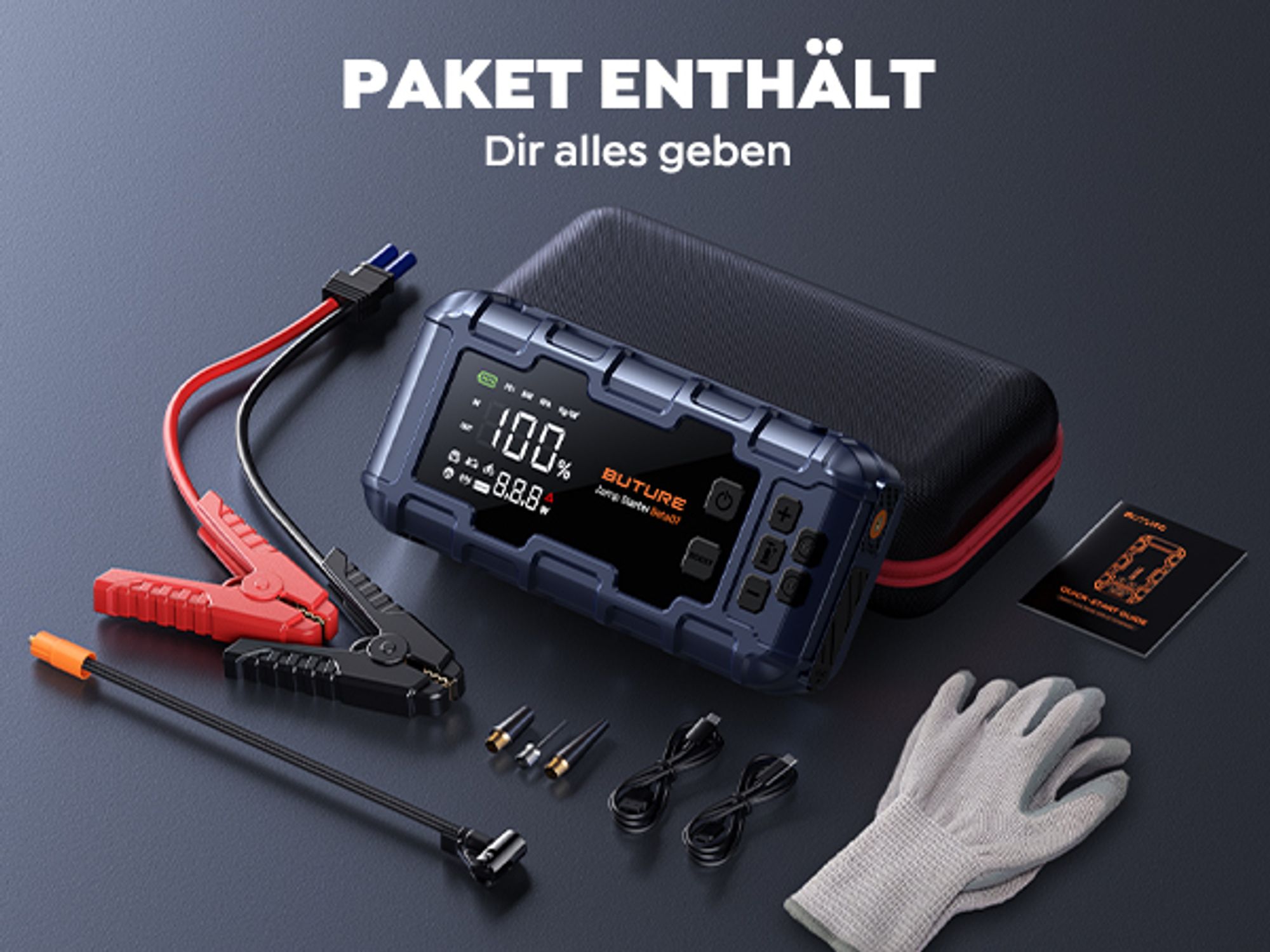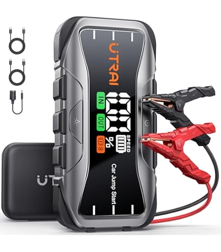 Dieses 3-in-1 Powerpaket ist dein Retter in der Not! Mit 6000A Startstrom bringt es selbst leere Batterien wieder zum Leben - für Autos, LKWs und Boote. Integrierter Luftkompressor mit LCD-Display für präzises Aufpumpen von Reifen. Und als Bonus: 12000mAh Powerbank für Handys & Tablets plus LED-Taschenlampe mit SOS-Funktion. Kompakt wie ein Buch passt es in jedes Handschuhfach. Funktioniert auch bei extremen Temperaturen (-30°C bis 65°C). Hol dir diese All-in-One-Lösung und sei für jede Panne gewappnet!