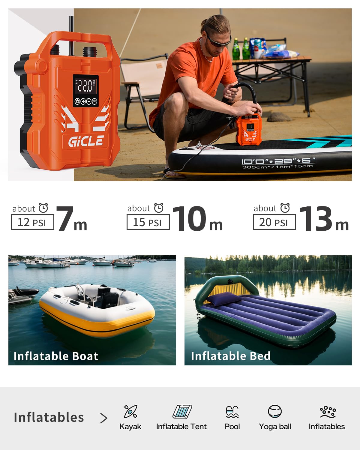 Endlich keine Muskelkraft mehr beim Aufpumpen! Diese elektrische SUP Pumpe von GICLE macht's dir super einfach. Einfach an die 12V Auto-Steckdose anschließen und los geht's. Mit 22PSI Maximaldruck und zwei Stufen - erst schnell aufpumpen, dann präzise den Enddruck einstellen. Die intelligente Auto-Off Funktion stoppt automatisch, wenn der gewünschte Druck erreicht ist. Perfekt für Paddleboards, aufblasbare Boote, Luftmatratzen und Poolspielzeug. Dein 10.6ft Board ist in nur 7-8 Minuten einsatzbereit! Mit LCD Display und verschiedenen Modi - so einfach war Aufpumpen noch nie!