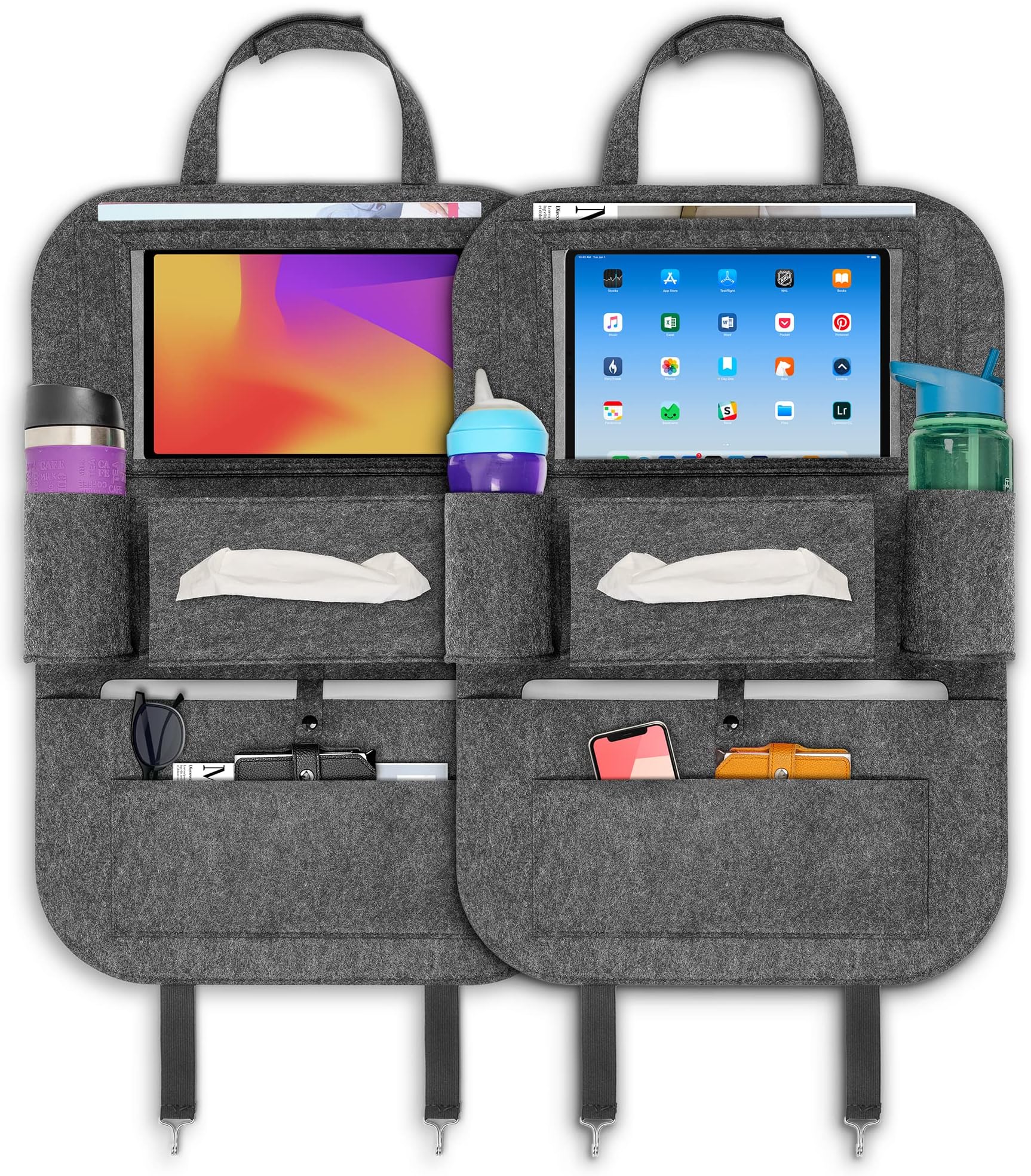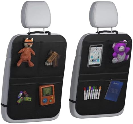 Endlich Ordnung im Auto! Dieses 2er-Set Organizer-Taschen von KITDAHOM sind die perfekte Lösung für alle, die im Auto Chaos vermeiden wollen. Aus hochwertigem Nylon gefertigt, sind sie wasserdicht und richtig robust - hält auch mal einen Tritt aus, ohne gleich kaputt zu gehen. Perfekt für Familien mit Kindern, die gerne mal mit schmutzigen Schuhen gegen den Sitz treten. In den vielen praktischen Taschen findest du Platz für Snacks, Getränke, Regenschirme und sogar ein Tablet! Ja, genau - die durchsichtige Tasche vorne ist speziell für Tablets gemacht, sodass die Kids während der Fahrt was gucken können, ohne dass das Ding rumfliegt. Die Installation ist super einfach: Einfach mit den verstellbaren Riemen an der Vordersitz-Lehne befestigen und schon ist alles griffbereit. Übrigens nicht nur fürs Auto geeignet - kannst du auch zu Hause nutzen, zum Beispiel am Kinderzimmerstuhl oder am Bürostuhl. Macht das Auto nicht nur ordentlicher, sondern schützt auch die teuren Autositze vor Flecken und Abnutzung. Die Taschen sind groß genug für all den Kleinkram, der sich sonst so ansammelt - von Trinkflaschen über Spielzeug bis hin zu Sonnenbrillen. Einfach praktisch, oder?