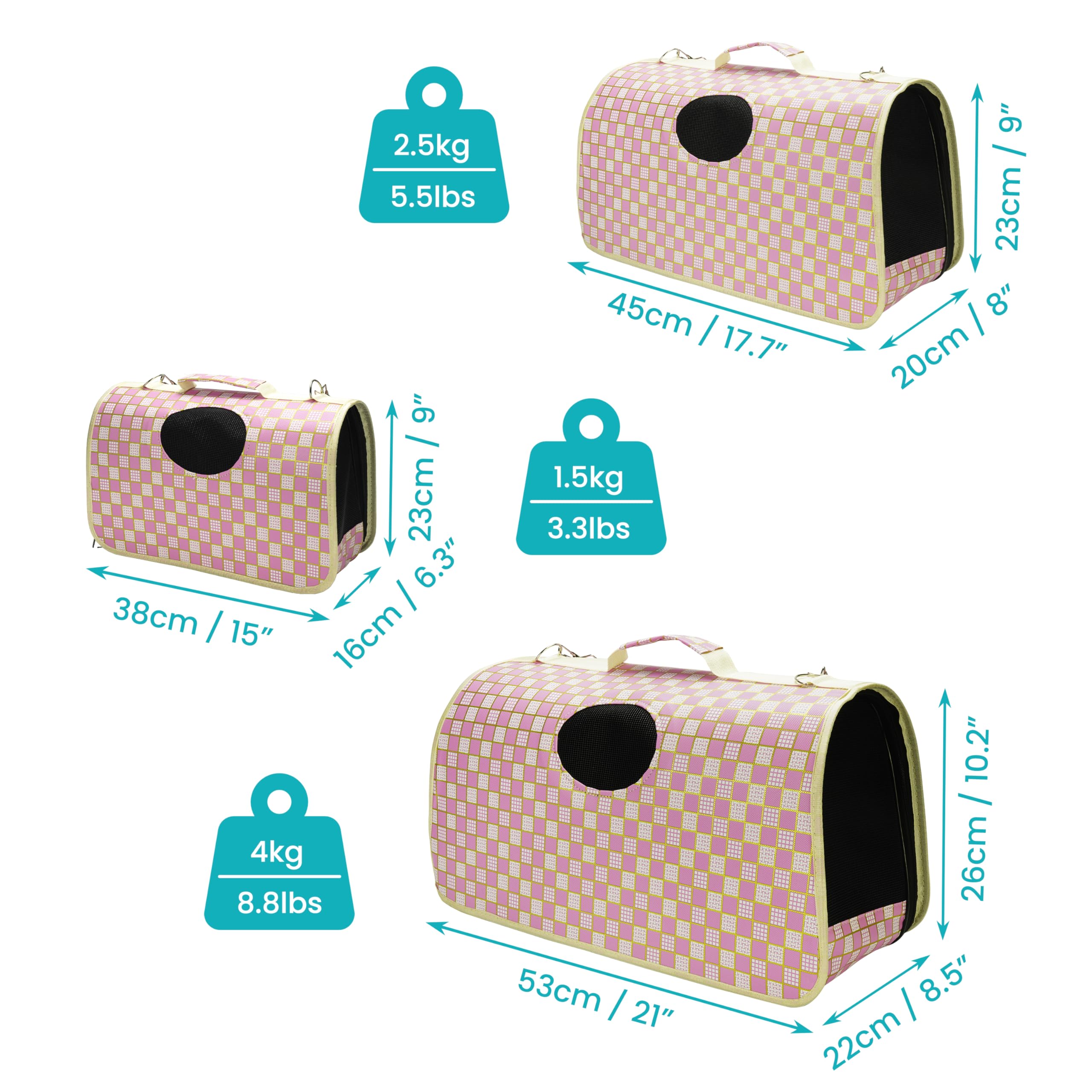 Dieses niedliche 3er Set von BELLE VOUS ist perfekt für alle Haustierbesitzer! Du bekommst drei rosa Tragetaschen in verschiedenen Größen: Klein (16x38x23cm für 1,5kg), Mittel (20x45x23cm für 2,5kg) und Groß (22x53x26cm für 4kg). Ideal für kleine Hunde, Katzen oder Kaninchen. Die Taschen sind aus leichtem, wasserabweisendem PU-Material mit atmungsaktiven Mesh-Fenstern - so siehst du dein Tier immer und es bekommt genug Luft. Super praktisch: Sie sind faltbar und lassen sich leicht verstauen. Mit robusten Reißverschlüssen und bequemen Tragegurten. Perfekt für Flugreisen, Autofahrten, Ausflüge oder Tierarztbesuche. Einfach in der Maschine waschen und schon sieht alles wieder wie neu aus. Deine tierischen Begleiter reisen stylisch und sicher!