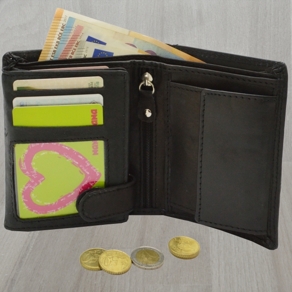 Stilvoll und praktisch! Diese kompakte Herren-Geldbörse von BEMON in Schwarz passt mit ihren Maßen von 10x6,5cm perfekt in jede Hosentasche. Aus echtem Rindsleder gefertigt, fühlt sie sich nicht nur hochwertig an, sondern wird mit der Zeit auch schön patiniert. Das dezente Kaffeebohnen-Design verleiht ihr einen individuellen Touch. Innen findest du praktische Fächer für Karten, Scheine und Münzen - alles gut organisiert und schnell greifbar. Ideal für unterwegs, ob im Alltag oder auf Reisen. Ein tolles Geschenk für stylebewusste Männer, die Wert auf Qualität und Funktionalität legen. Einfach in die Tasche stecken und losgehen - so praktisch kann Style sein!