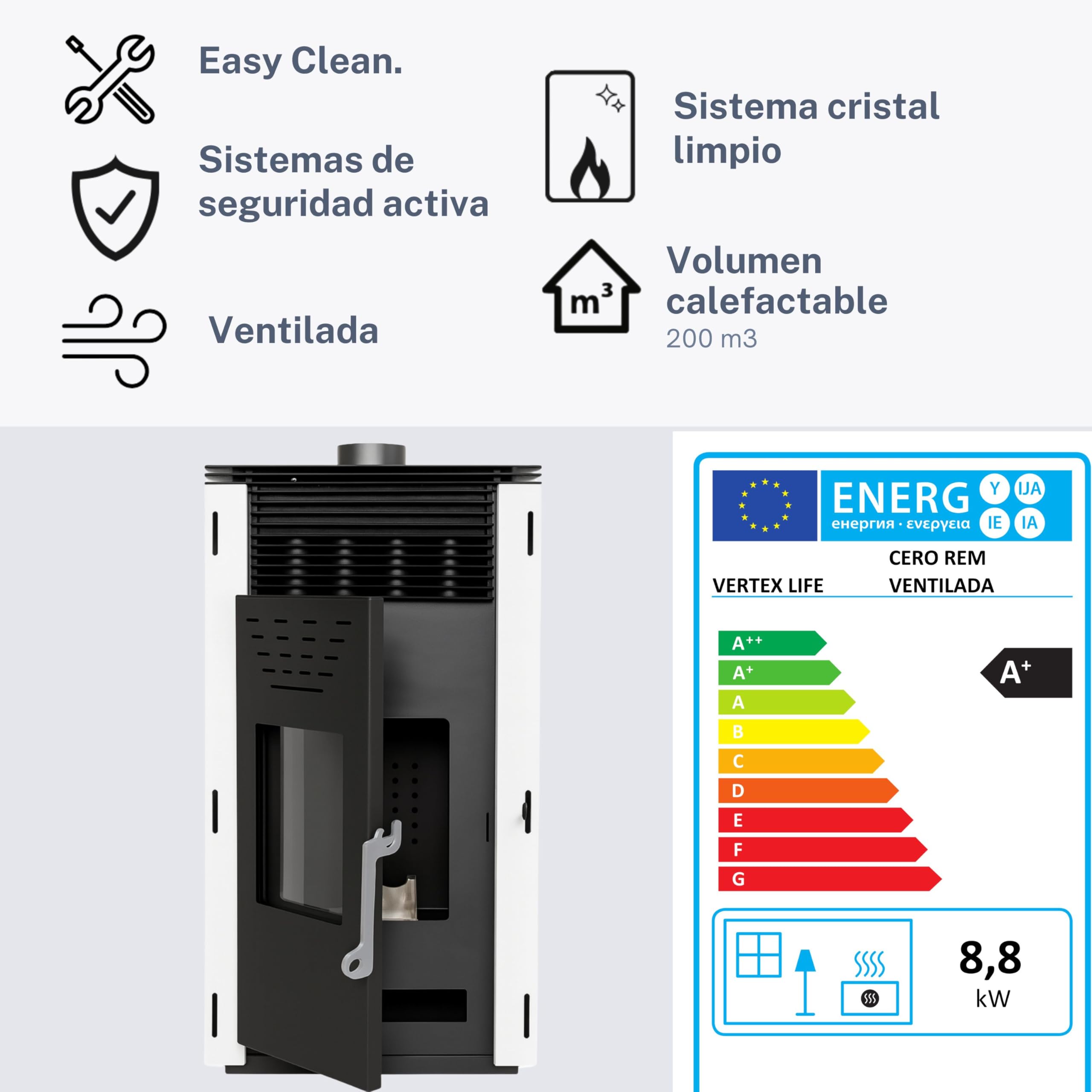 Dieser EIDER BIOMASA Pelletofen ist ein echtes Unikat - er braucht keinen Stromanschluss! 10kW Leistung für Räume bis 200m³. Mit 15kg Trichter für lange Heizperioden. Verbrauch nur 1.4-1.9kg/h - super effizient. Kompakte 97x51x47cm für jeden Raum. Energieeffizienzklasse A. Volle mechanische Steuerung per Handhebel. Ideal für Ferienhäuser oder bei Stromausfällen. Umweltfreundliche Wärme ohne Elektronik. Seit über 30 Jahren Erfahrung in Biomasse - Qualität aus Granada!