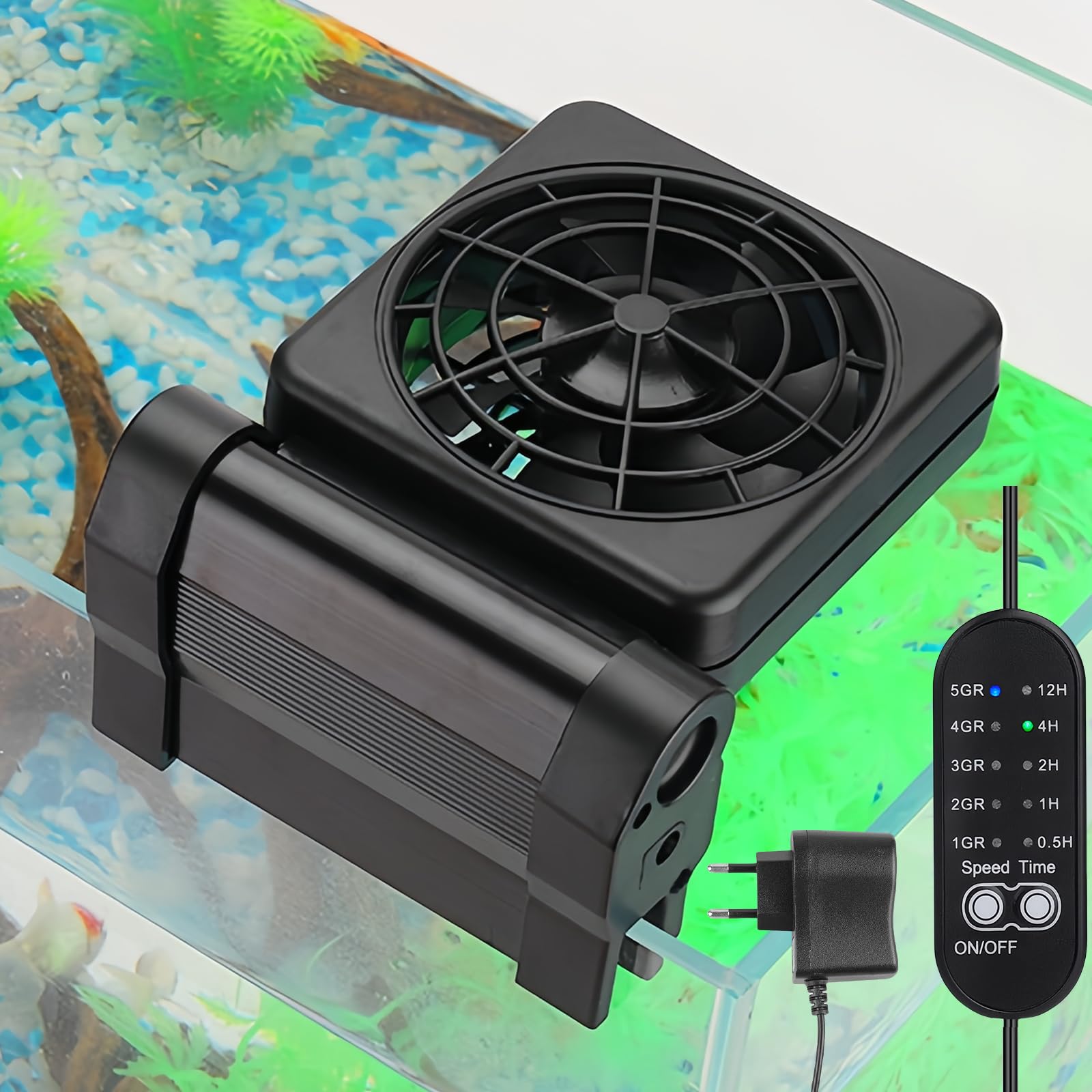 Deine Fische werden's dir danken! Dieser Aquarium-Lüfter sorgt auch an heißen Sommertagen für die perfekte Wassertemperatur. Mit 5 einstellbaren Geschwindigkeiten kannst du die Kühlung genau anpassen - senkt die Temperatur um bis zu 4°C! Aus hochwertiger Aluminiumlegierung, rostfrei und langlebig. Die Klemme lässt sich einfach am Aquarienrand befestigen, keine komplizierte Installation nötig. Für Süß- und Meerwasseraquarien gleichermaßen geeignet. Maße: 12,7x9cm, passt auf Glas bis 1,05cm Dicke. Auch super für Terrarien oder Kleintierkäfige. Gib deinen Fischen den Komfort, den sie verdienen - mit diesem effizienten Kühler machst du alles richtig! Einfach anschließen, Geschwindigkeit wählen und die angenehme Kühle genießen.