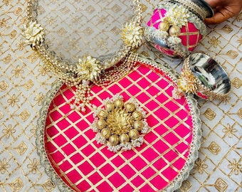 Dieses wunderschöne BRACOP Pooja Thali-Set ist perfekt für indische Zeremonien und Feiertage! Das 3-teilige Set aus Messing in Gold-Optik besteht aus einer Thali (20,3 cm Durchmesser), einem Karva-Topf und einer Channi. Super für Karwa Chauth, Hochzeiten, Geburtstage oder als Dekoration für zu Hause. Kann auch als Schmuck-Organizer oder Sammlerstück verwendet werden. Hochwertige Verarbeitung - ein richtiger Hingucker! Tolles Geschenk für besondere Anlässe. Das Channi-Design kann variieren - jedes Set ist ein Unikat! Bringt traditionellen indischen Flair in dein Zuhause oder ist das perfekte Geschenk für liebe Freunde und Familie.