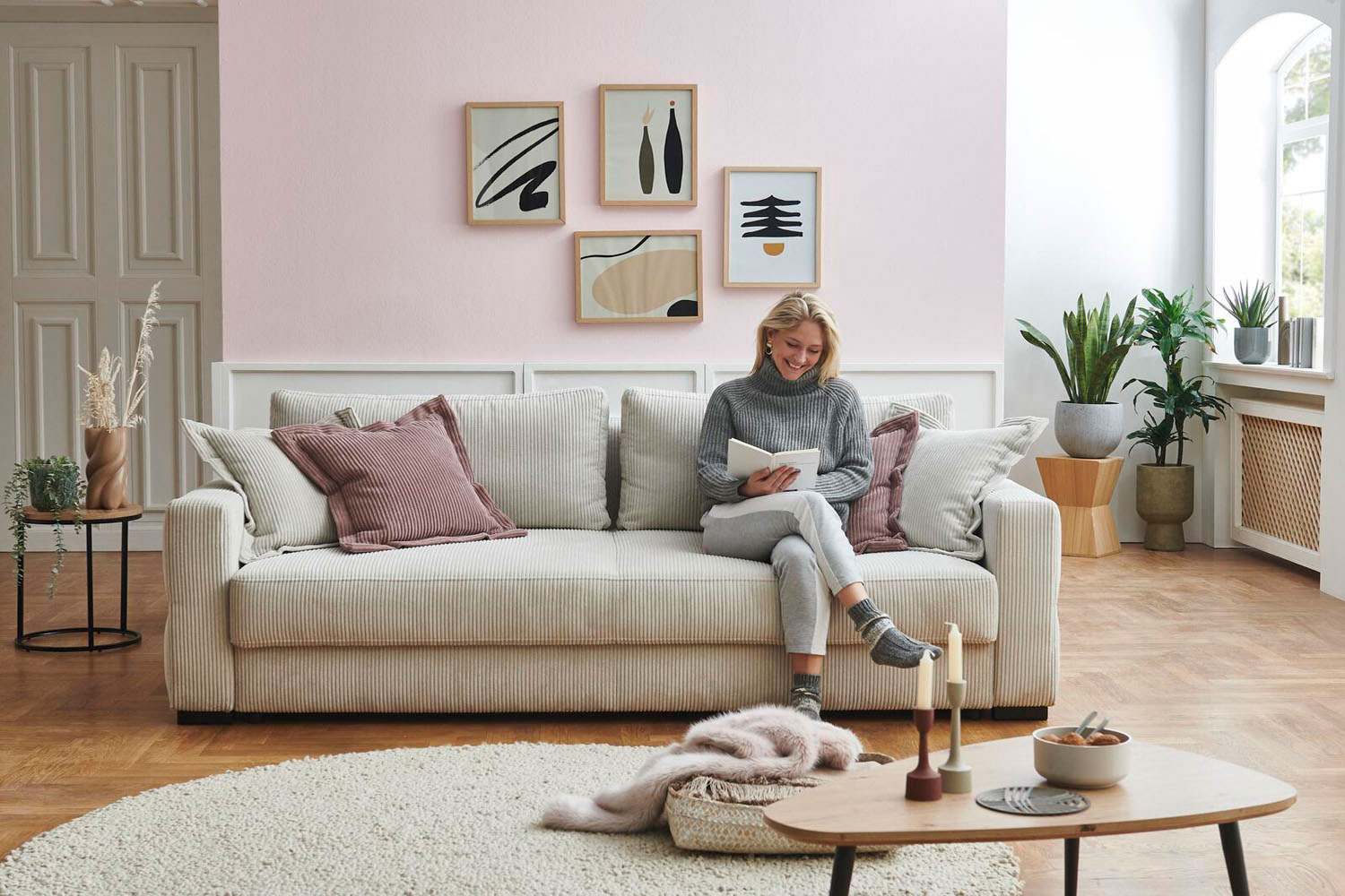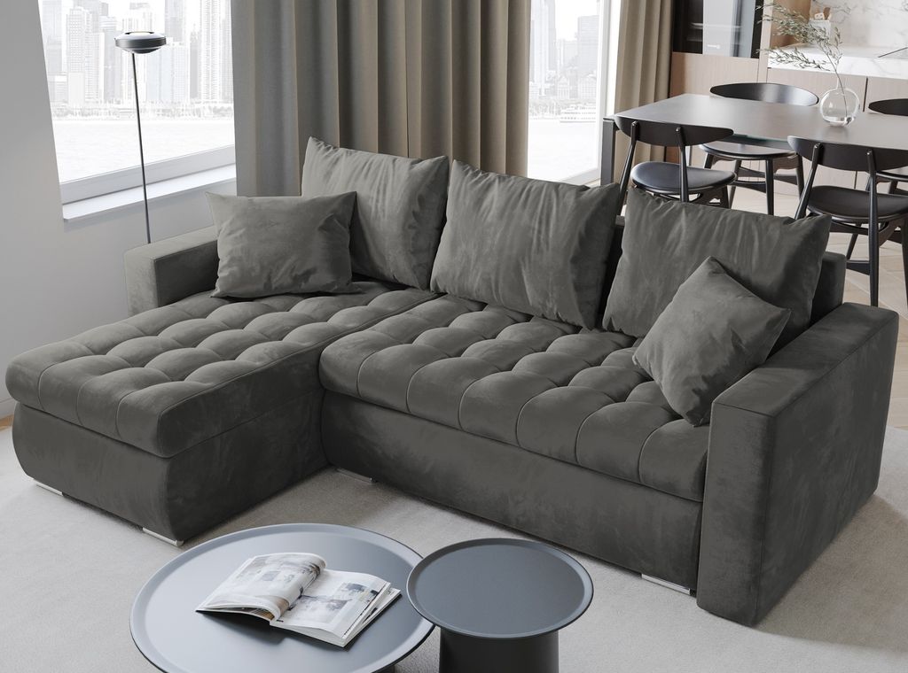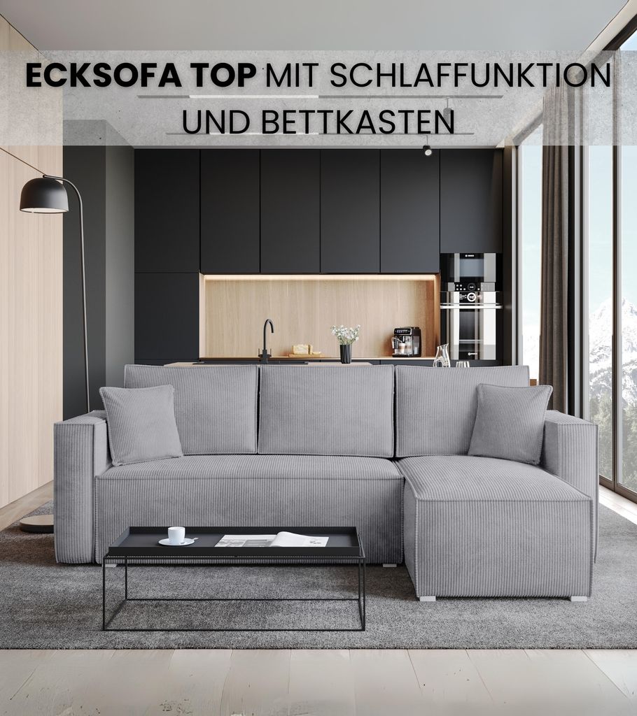 Boah, dieses Ecksofa ist ja mal richtig vielseitig! Mit 275cm Länge bietet es jede Menge Sitzfläche für die ganze Familie oder viele Gäste. Aus weichem Cordstoff in Hellgrau - sieht nicht nur gut aus, sondern ist auch robust. Das geniale: Es hat eine Schlaffunktion! Einfach umklappen und schon hast du ein 120x230cm großes Doppelbett für Übernachtungsgäste. Noch praktischer: Unter der Sitzfläche ist ein großer Bettkasten versteckt - perfekt für Decken, Kissen oder andere Sachen die man nicht ständig braucht. Die Polsterung mit PUR-Schaum und Wellenfedern sorgt für mega Sitzkomfort, auch wenn man mal länger drauf sitzt. Der stabile Rahmen aus Möbelplatte und Massivholz hält was aus. Mit den mitgelieferten Kissen (2 große, 2 kleine) sieht es gleich richtig gemütlich aus. Wird bis zur Bordsteinkante geliefert und ist easy aufzubauen. Perfekt fürs Wohnzimmer - gemütlich, praktisch und sieht noch dazu gut aus. Einfach ein Traumsofa für alle die viel Platz brauchen und mal Gäste übernachten lassen wollen!