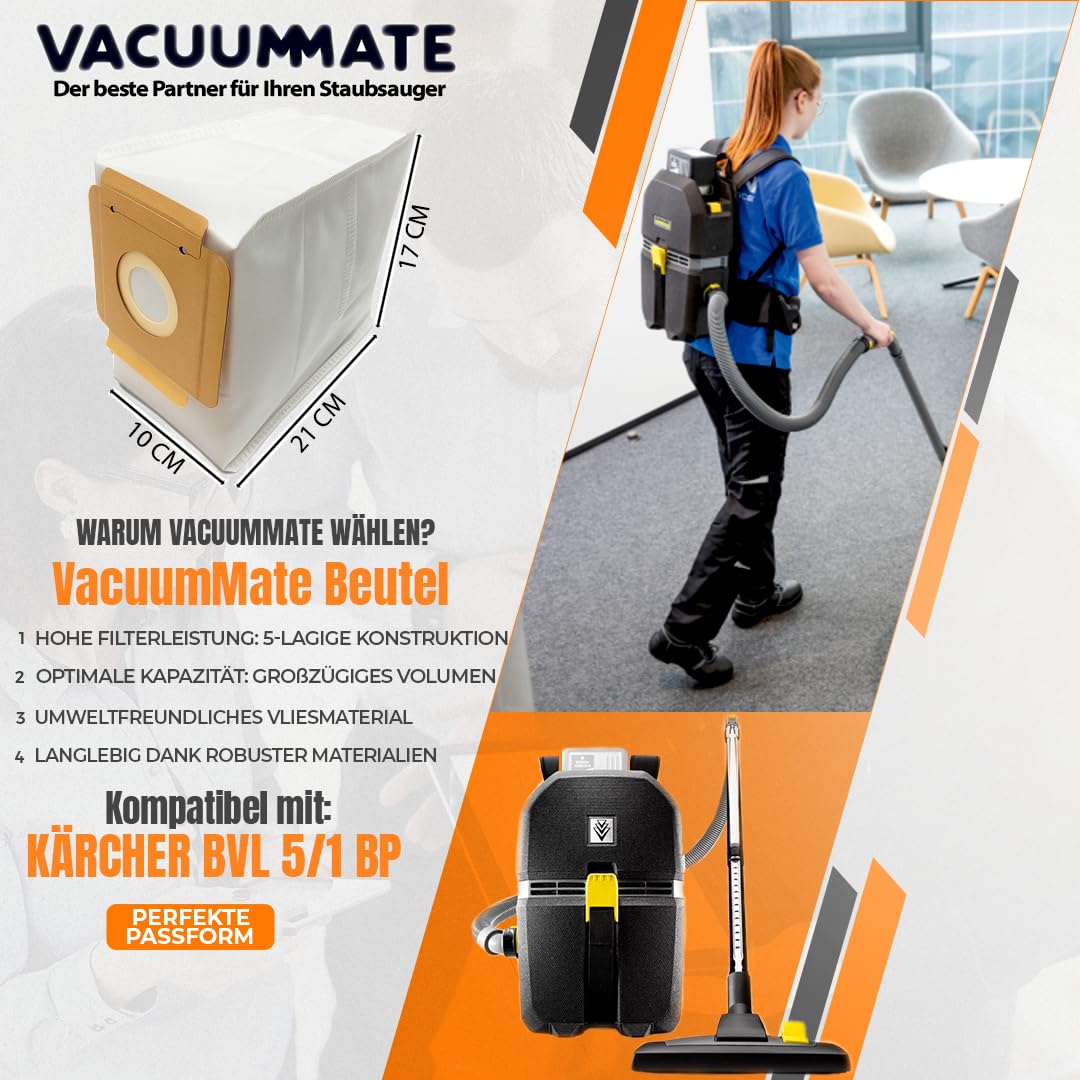 Perfekte Passform für deinen Kärcher BVL 5/1 BP Rucksackstaubsauger! Diese VacuumMate Staubbeutel sind speziell für professionelle Reinigungsaufgaben entwickelt. Mit 5-lagiger Hochleistungsfiltration halten sie selbst feinste Staubpartikel und Allergene zuverlässig zurück. Aus reißfestem Vliesmaterial, das auch bei intensivem Gebrauch nicht platzt. Die große Kapazität bedeutet weniger Wechsel und mehr Zeitersparnis. Einfache Installation mit stabilem Kartonring für dichten Sitz - kein Auslaufen, keine Staubleckagen! Umweltfreundliches Material für bewusste Nutzer. Ideal für Gebäudereinigung, Krankenhäuser, Werkstätten und überall dort, wo hohe Hygienestandards wichtig sind. Halte deinen Staubsauger mit der vollen Saugleistung am Laufen und spare dabei Zeit und Geld. 10 Beutel im Pack - Vorrat für lange Zeit!