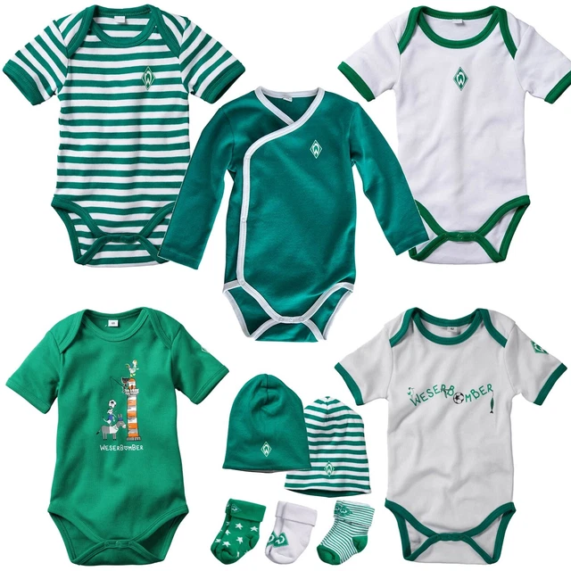 Der süßeste Werder-Fan im Stadion! Dieser Babybody aus 100% GOTS-zertifizierter Bio-Baumwolle ist perfekt für die kleinsten Bremen-Fans. Mit dem coolen Allover-Print und der Werder-Raute auf der Brust zeigt dein Baby gleich, wo's langgeht. Der seitliche Druckknopfverschluss macht das An- und Ausziehen super einfach - besonders praktisch beim Wickeln. Die langen Ärmel und Beine schützen vor kühleren Temperaturen. Weiches, hautfreundliches Material das auch bei empfindlicher Haut keine Probleme macht. In Grün mit weißem Schriftzug - genau die richtigen Farben! Perfekt für den Spieltag oder einfach für jeden Tag. Für einen perfekten Start ins Fan-Leben!