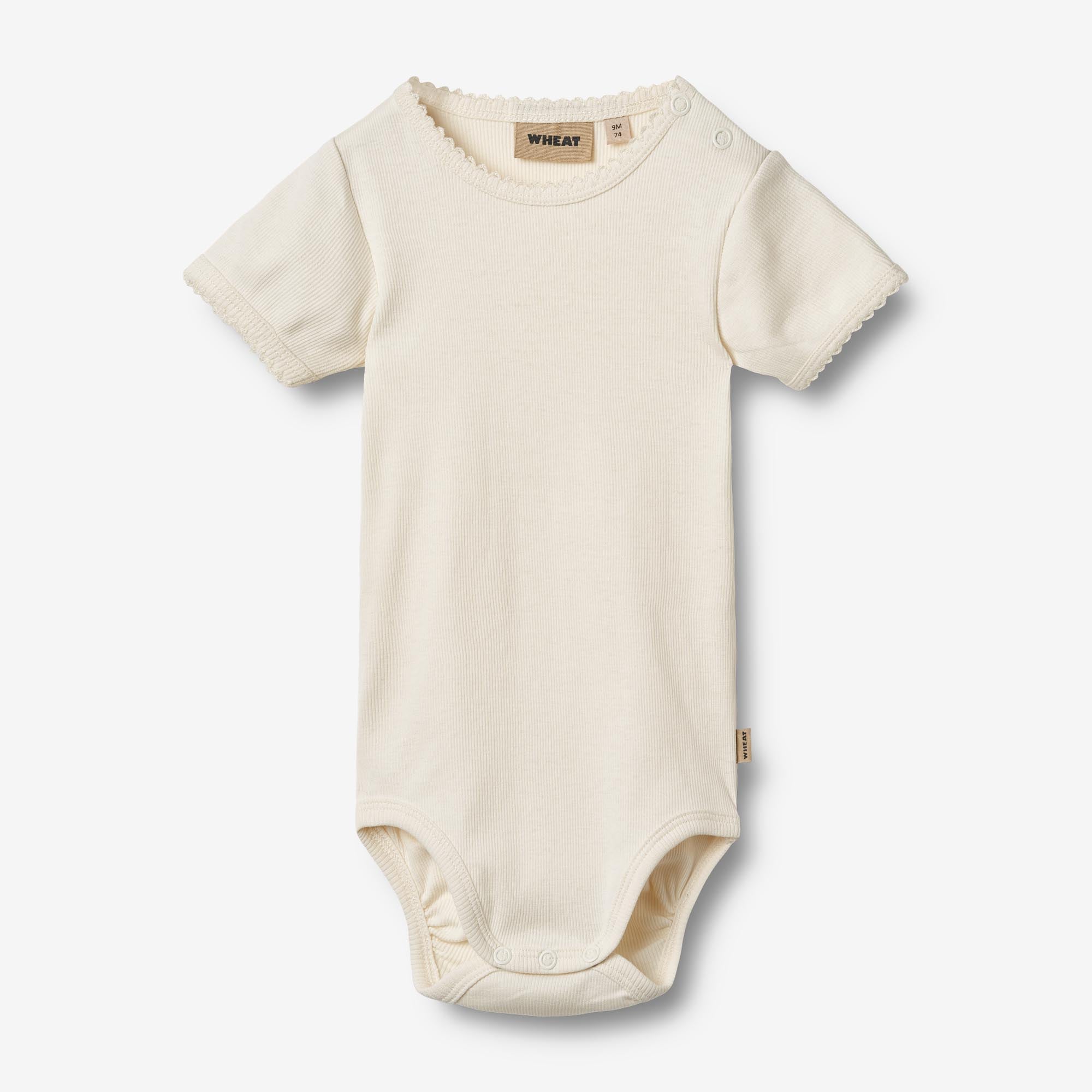 Oh wie süß! Dieser Babybody von Wheat ist einfach nur kuschelig weich. Aus 96% Bio-Baumwolle und 4% Elastan - perfekt für empfindliche Babyhaut. Die süßen Spitzendetails am Halsausschnitt und an den Ärmchen machen ihn besonders hübsch. Die Druckknöpfe an Schulter und Schritt sind super praktisch beim An- und Ausziehen deines kleinen Schatzes. Unisex Design - passt für Jungen und Mädchen gleichermaßen. Ob als Unterwäsche oder allein getragen, dieser Body ist ein Must-have in jeder Babygarderobe. GOTS zertifiziert und OEKO-TEX Standard 100 - da kannst du sicher sein, dass nur das Beste für dein Baby drinsteckt. Atmungsaktiv und leicht, ideal zum Spielen und Toben. Dein Baby wird sich darin pudelwohl fühlen!